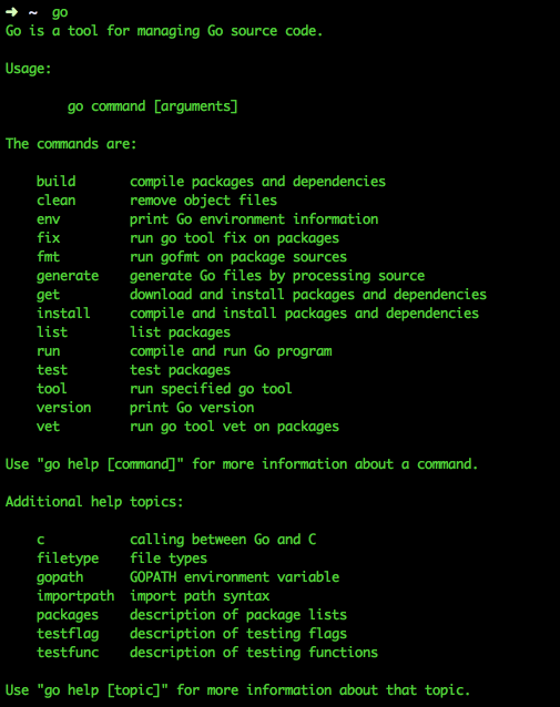 Go的三种安装方式 Go有多种安装方式,你可以选择自己喜欢的。这里我们介绍三种最常见的安装方式: Go源码安装:这是一种标准的软件安装方式。对于经常使用Unix类系统的用户,尤其对于开发者来说,从源码安装可以自己定制。 Go标准包安装:Go提供了方便的安装包,支持Windows、Linux、Mac等系统。这种方式适合快速安装,可根据自己的系统位数下载好相应的安装包,一路next就可以轻松安装了。推荐这种方式 第三方工具安装:目前有很多方便的第三方软件包工具,例如Ubuntu的apt-get、Mac的homebrew等。这种安装方式适合那些熟悉相应系统的用户。 最后,如果你想在同一个系统中安装多个版本的Go,你可以参考第三方工具GVM,这是目前在这方面做得最好的工具,除非你知道怎么处理。 Go源码安装 在Go的源代码中,有些部分是用Plan 9 C和AT&T汇编写的,因此假如你要想从源码安装,就必须安装C的编译工具。 在Mac系统中,只要你安装了Xcode,就已经包含了相应的编译工具。 在类Unix系统中,需要安装gcc等工具。例如Ubuntu系统可通过在终端中执行sudo apt-get install gcc libc6-dev来安装编译工具。 在Windows系统中,你需要安装MinGW,然后通过MinGW安装gcc,并设置相应的环境变量。 你可以直接去官网下载源码,找相应的goVERSION.src.tar.gz的文件下载,下载之后解压缩到$HOME目录,执行如下代码: ```asp cd go/src ./all.bash ``` 运行all.bash后出现"ALL TESTS PASSED"字样时才算安装成功。 上面是Unix风格的命令,Windows下的安装方式类似,只不过是运行all.bat,调用的编译器是MinGW的gcc。 如果是Mac或者Unix用户需要设置几个环境变量,如果想重启之后也能生效的话把下面的命令写到.bashrc或者.zshrc里面, ```asp export GOPATH=$HOME/gopath export PATH=$PATH:$HOME/go/bin:$GOPATH/bin ``` 如果你是写入文件的,记得执行bash .bashrc或者bash .zshrc使得设置立马生效。 如果是window系统,就需要设置环境变量,在path里面增加相应的go所在的目录,设置gopath变量。 当你设置完毕之后在命令行里面输入go,看到如下图片即说明你已经安装成功  Go标准包安装 Go提供了每个平台打好包的一键安装,这些包默认会安装到如下目录:/usr/local/go (Windows系统:c:\Go),当然你可以改变他们的安装位置,但是改变之后你必须在你的环境变量中设置如下信息: ```asp export GOROOT=$HOME/go export GOPATH=$HOME/gopath export PATH=$PATH:$GOROOT/bin:$GOPATH/bin ``` 上面这些命令对于Mac和Unix用户来说最好是写入.bashrc或者.zshrc文件,对于windows用户来说当然是写入环境变量。 如何判断自己的操作系统是32位还是64位? 我们接下来的Go安装需要判断操作系统的位数,所以这小节我们先确定自己的系统类型。 Windows系统用户请按Win+R运行cmd,输入systeminfo后回车,稍等片刻,会出现一些系统信息。在“系统类型”一行中,若显示“x64-based PC”,即为64位系统;若显示“X86-based PC”,则为32位系统。 Mac系统用户建议直接使用64位的,因为Go所支持的Mac OS X版本已经不支持纯32位处理器了。 Linux系统用户可通过在Terminal中执行命令arch(即uname -m)来查看系统信息: 64位系统显示 > x86_64 32位系统显示 > i386 Mac 安装 访问下载地址,32位系统下载go1.4.2.darwin-386-osx10.8.pkg,64位系统下载go1.4.2.darwin-amd64-osx10.8.pkg,双击下载文件,一路默认安装点击下一步,这个时候go已经安装到你的系统中,默认已经在PATH中增加了相应的~/go/bin,这个时候打开终端,输入go 看到类似上面源码安装成功的图片说明已经安装成功 如果出现go的Usage信息,那么说明go已经安装成功了;如果出现该命令不存在,那么可以检查一下自己的PATH环境变中是否包含了go的安装目录。 Linux 安装 访问下载地址,32位系统下载go1.4.2.linux-386.tar.gz,64位系统下载go1.4.2.linux-amd64.tar.gz, 假定你想要安装Go的目录为 $GO_INSTALL_DIR,后面替换为相应的目录路径。 解压缩tar.gz包到安装目录下:tar zxvf go1.4.2.linux-amd64.tar.gz -C $GO_INSTALL_DIR。 设置PATH,export PATH=$PATH:$GO_INSTALL_DIR/go/bin 然后执行go  图1.2 Linux系统下安装成功之后执行go显示的信息 如果出现go的Usage信息,那么说明go已经安装成功了;如果出现该命令不存在,那么可以检查一下自己的PATH环境变中是否包含了go的安装目录。 Windows 安装 访问Google Code 下载页,32 位请选择名称中包含 windows-386 的 msi 安装包,64 位请选择名称中包含 windows-amd64 的。下载好后运行,不要修改默认安装目录 C:\Go\,若安装到其他位置会导致不能执行自己所编写的 Go 代码。安装完成后默认会在环境变量 Path 后添加 Go 安装目录下的 bin 目录 C:\Go\bin\,并添加环境变量 GOROOT,值为 Go 安装根目录 C:\Go\ 。 验证是否安装成功 在运行中输入 cmd 打开命令行工具,在提示符下输入 go,检查是否能看到 Usage 信息。输入 cd %GOROOT%,看是否能进入 Go 安装目录。若都成功,说明安装成功。 不能的话请检查上述环境变量 Path 和 GOROOT 的值。若不存在请卸载后重新安装,存在请重启计算机后重试以上步骤。 第三方工具安装 GVM gvm是第三方开发的Go多版本管理工具,类似ruby里面的rvm工具。使用起来相当的方便,安装gvm使用如下命令: ```asp bash < <(curl -s -S -L https://raw.githubusercontent.com/moovweb/gvm/master/binscripts/gvm-installer) ``` 安装完成后我们就可以安装go了: ```asp gvm install go1.4.2 gvm use go1.4.2 ``` 也可以使用下面的命令,省去每次调用gvm use的麻烦: gvm use go1.4.2 --default 执行完上面的命令之后GOPATH、GOROOT等环境变量会自动设置好,这样就