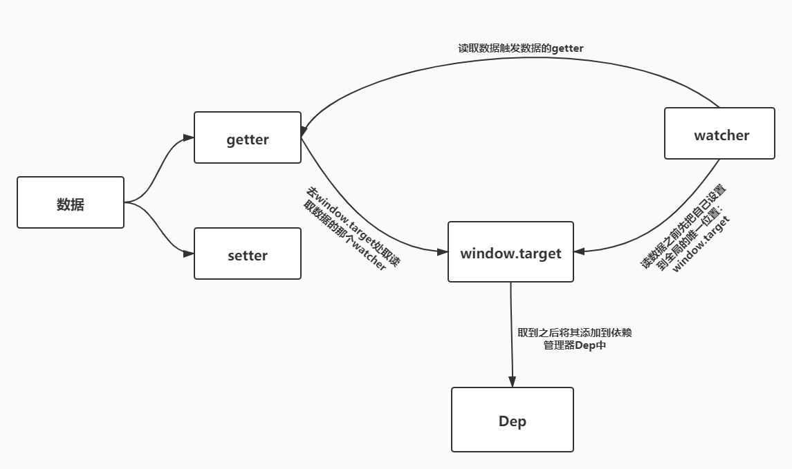 ## 1. 前言 在上一篇文章中,我们知道:数据驱动视图的关键点则在于我们如何知道数据发生了变化,只要知道数据在什么时候变了,那么问题就变得迎刃而解,我们只需在数据变化的时候去通知视图更新即可。 要想知道数据什么时候被读取了或数据什么时候被改写了,其实不难,`JS`为我们提供了`Object.defineProperty`方法,通过该方法我们就可以轻松的知道数据在什么时候发生变化。 ## 2. 使Object数据变得“可观测” 数据的每次读和写能够被我们看的见,即我们能够知道数据什么时候被读取了或数据什么时候被改写了,我们将其称为数据变的‘可观测’。 要将数据变的‘可观测’,我们就要借助前言中提到的`Object.defineProperty`方法了,在本文中,我们就使用这个方法使数据变得“可观测”。 首先,我们定义一个数据对象`car`: ```javascript let car = { 'brand':'BMW', 'price':3000 } ``` 我们定义了这个`car`的品牌`brand`是`BMW`,价格`price`是3000。现在我们可以通过`car.brand`和`car.price`直接读写这个`car`对应的属性值。但是,当这个`car`的属性被读取或修改时,我们并不知情。那么应该如何做才能够让`car`主动告诉我们,它的属性被修改了呢? 接下来,我们使用`Object.defineProperty() `改写上面的例子: ```javascript let car = {} let val = 3000 Object.defineProperty(car, 'price', { enumerable: true, configurable: true, get(){ console.log('price属性被读取了') return val }, set(newVal){ console.log('price属性被修改了') val = newVal } }) ``` 通过`Object.defineProperty() `方法给`car`定义了一个`price`属性,并把这个属性的读和写分别使用`get()`和`set()`进行拦截,每当该属性进行读或写操作的时候就会触发`get()`和`set()`。如下图:  可以看到,`car`已经可以主动告诉我们它的属性的读写情况了,这也意味着,这个`car`的数据对象已经是“可观测”的了。 为了把`car`的所有属性都变得可观测,我们可以编写如下代码: ```javascript // 源码位置:src/core/observer/index.js /** * Observer类会通过递归的方式把一个对象的所有属性都转化成可观测对象 */ export class Observer { constructor (value) { this.value = value // 给value新增一个__ob__属性,值为该value的Observer实例 // 相当于为value打上标记,表示它已经被转化成响应式了,避免重复操作 def(value,'__ob__',this) if (Array.isArray(value)) { // 当value为数组时的逻辑 // ... } else { this.walk(value) } } walk (obj: Object) { const keys = Object.keys(obj) for (let i = 0; i < keys.length; i++) { defineReactive(obj, keys[i]) } } } /** * 使一个对象转化成可观测对象 * @param { Object } obj 对象 * @param { String } key 对象的key * @param { Any } val 对象的某个key的值 */ function defineReactive (obj,key,val) { // 如果只传了obj和key,那么val = obj[key] if (arguments.length === 2) { val = obj[key] } if(typeof val === 'object'){ new Observer(val) } Object.defineProperty(obj, key, { enumerable: true, configurable: true, get(){ console.log(`${key}属性被读取了`); return val; }, set(newVal){ if(val === newVal){ return } console.log(`${key}属性被修改了`); val = newVal; } }) } ``` 在上面的代码中,我们定义了`observer`类,它用来将一个正常的`object`转换成可观测的`object`。 并且给`value`新增一个`__ob__`属性,值为该`value`的`Observer`实例。这个操作相当于为`value`打上标记,表示它已经被转化成响应式了,避免重复操作 然后判断数据的类型,只有`object`类型的数据才会调用`walk`将每一个属性转换成`getter/setter`的形式来侦测变化。 最后,在`defineReactive`中当传入的属性值还是一个`object`时使用` new observer(val)`来递归子属性,这样我们就可以把`obj`中的所有属性(包括子属性)都转换成`getter/seter`的形式来侦测变化。 也就是说,只要我们将一个`object`传到`observer`中,那么这个`object`就会变成可观测的、响应式的`object`。 `observer`类位于源码的`src/core/observer/index.js`中。 那么现在,我们就可以这样定义`car`: ```javascript let car = new Observer({ 'brand':'BMW', 'price':3000 }) ``` 这样,`car`的两个属性都变得可观测了。 ## 3. 依赖收集 ### 3.1 什么是依赖收集 在上一章中,我们迈出了第一步:让`object`数据变的可观测。变的可观测以后,我们就能知道数据什么时候发生了变化,那么当数据发生变化时,我们去通知视图更新就好了。那么问题又来了,视图那么大,我们到底该通知谁去变化?总不能一个数据变化了,把整个视图全部更新一遍吧,这样显然是不合理的。此时,你肯定会想到,视图里谁用到了这个数据就更新谁呗。对!你想的没错,就是这样。 视图里谁用到了这个数据就更新谁,我们换个优雅说法:我们把"谁用到了这个数据"称为"谁依赖了这个数据",我们给每个数据都建一个依赖数组(因为一个数据可能被多处使用),谁依赖了这个数据(即谁用到了这个数据)我们就把谁放入这个依赖数组中,那么当这个数据发生变化的时候,我们就去它对应的依赖数组中,把每个依赖都通知一遍,告诉他们:"你们依赖的数据变啦,你们该更新啦!"。这个过程就是依赖收集。 ### 3.2 何时收集依赖?何时通知依赖更新? 明白了什么是依赖收集后,那么我们到底该在何时收集依赖?又该在何时通知依赖更新? 其实这个问题在上一小节中已经回答了,我们说过:谁用到了这个数据,那么当这个数据变化时就通知谁。所谓谁用到了这个数据,其实就是谁获取了这个数据,而可观测的数据被获取时会触发`getter`属性,那么我们就可以在`getter`中收集这个依赖。同样,当这个数据变化时会触