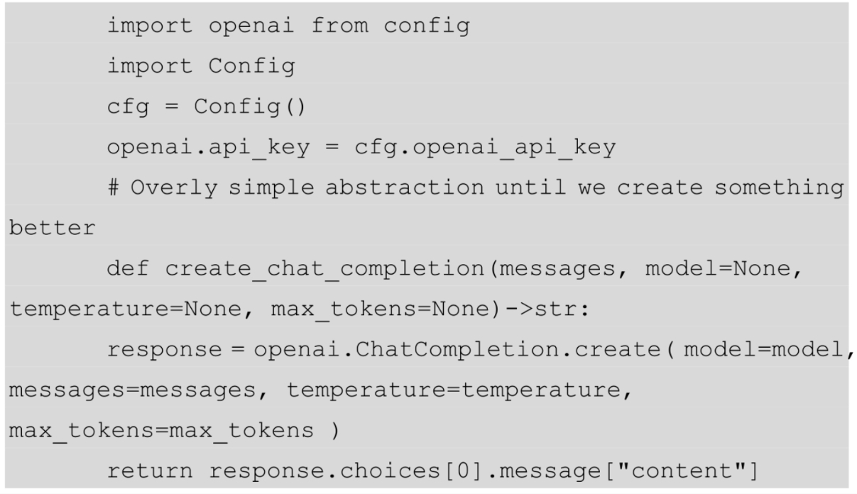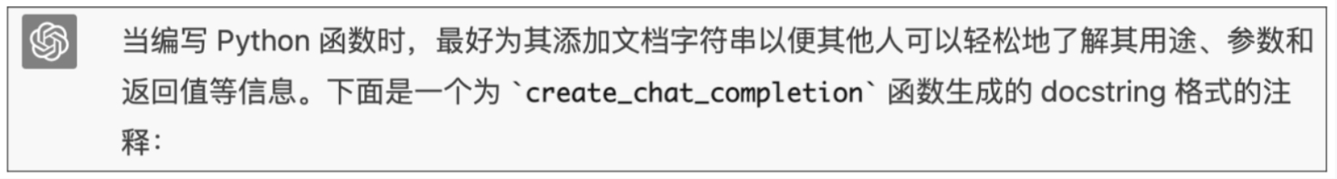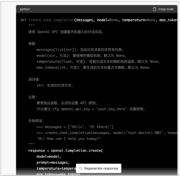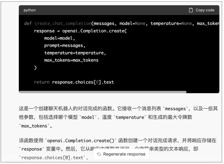 新手程序员在入门之初,最好的学习路径就是直接阅读其他人的代码,从中学习别人是怎么写的,为什么这么写。过去,这个学习过程可能需要广泛阅读官方文档,在GitHub issue上提问,上Stack Overflow网站查询,见缝插针找同部门的老同事请教……现在,我们可以试试让ChatGPT来当这个老师,由ChatGPT解释代码。 比如我们在GitHub首页右侧的开源项目趋势榜上找到今日热度最高的项目来学习,叫Auto-GPT(由于ChatGPT的火热,目前趋势榜单上几乎都是ChatGPT相关内容)。在主要源代码目录scripts/里,看到一个叫llm_utils.py的Python文件。一般来说,以"util"命名的文件里放的都是独立的抽象功能,可以方便读者快速阅读。我们就让ChatGPT来解释这个文件吧。 请解释下面这段python代码:    ChatGPT很贴心地把文件分成了三段,分别解释了第一段导入OpenAI外部库。第二段导入config.py内部实现类并创建对象,将对象内的属性值传给OpenAI。第三段对具体函数做解释,分别包括入参和出参的含义、数据类型等。 如果是我们自己写代码,其实同样可以让ChatGPT解读。这样可以看看ChatGPT的理解,是否和我们编程时考虑的逻辑保持一致。未来由其他同事来维护这段代码时,不至于产生误解。为了长期留存ChatGPT的解读,我们还可以指定ChatGPT按照代码注释说明文档的形式来生成,如下图所示。 为上述create_chat_completion函数生成一个docstring格式的注释。   ChatGPT生成结果非常惊艳。ChatGPT不光解释了入参和出参,还根据上下文提示了config配置的依赖前提,并给出了一个具体的函数使用和输出示例,可以说大大提升了代码的可维护性。