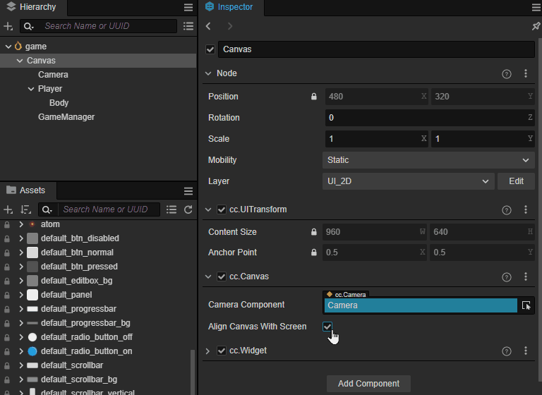 2D 横版游戏中必须要处理卷轴问题,所谓的卷轴就是相机随着角色的运动而运动,导致看到的场景不太一样的情况。 为了实现卷轴,我们需要允许 Camera 可以移动并不在强制和 Canvas 对齐,取消 Canvas 节点上 cc.Canvas 组件的 Align Canvas With Screen 属性:  此时运行游戏就可以观察到相机的跟随情况: