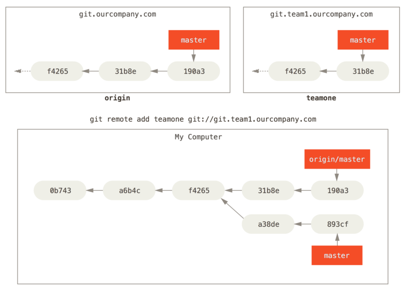 远程引用是对远程仓库的引用(指针),包括分支、标签等等。你可以通过 git ls-remote (remote) 来显式地获得远程引用的完整列表,或者通过 git remote show (remote) 获得远程分支的更多信息。然而,一个更常见的做法是利用远程跟踪分支。 远程跟踪分支是远程分支状态的引用。它们是你不能移动的本地引用,当你做任何网络通信操作时,它们会自动移动。远程跟踪分支像是你上次连接到远程仓库时,那些分支所处状态的书签。 它们以 (remote)/(branch) 形式命名。例如,如果你想要看你最后一次与远程仓库 origin 通信时 master 分支的状态,你可以查看 origin/master 分支。你与同事合作解决一个问题并且他们推送了一个 iss53 分支,你可能有自己的本地 iss53 分支;但是在服务器上的分支会指向 origin/iss53 的提交。 这可能有一点儿难以理解,让我们来看一个例子。假设你的网络里有一个在 git.ourcompany.com 的 Git 服务器。如果你从这里克隆,Git 的 clone 命令会为你自动将其命名为 origin,拉取它的所有数据,创建一个指向它的 master 分支的指针,并且在本地将其命名为 origin/master。Git 也会给你一个与 origin 的 master 分支在指向同一个地方的本地 master 分支,这样你就有工作的基础。 “origin” 并无特殊含义 远程仓库名字 “origin” 与分支名字 “master” 一样,在 Git 中并没有任何特别的含义一样。同时 “master” 是当你运行 git init 时默认的起始分支名字,原因仅仅是它的广泛使用,“origin” 是当你运行 git clone 时默认的远程仓库名字。如果你运行 git clone -o booyah,那么你默认的远程分支名字将会是 booyah/master。  如果你在本地的 master 分支做了一些工作,然而在同一时间,其他人推送提交到 git.ourcompany.com 并更新了它的 master 分支,那么你的提交历史将向不同的方向前进。也许,只要你不与 origin 服务器连接,你的 origin/master 指针就不会移动。  如果要同步你的工作,运行 git fetch origin 命令。这个命令查找 “origin” 是哪一个服务器(在本例中,它是 git.ourcompany.com),从中抓取本地没有的数据,并且更新本地数据库,移动 origin/master 指针指向新的、更新后的位置。  为了演示有多个远程仓库与远程分支的情况,我们假定你有另一个内部 Git 服务器,仅用于你的 sprint 小组的开发工作。这个服务器位于 git.team1.ourcompany.com。你可以运行 git remote add 命令添加一个新的远程仓库引用到当前的项目,这个命令我们会在 Chapter 2 中详细说明。将这个远程仓库命名为 teamone,将其作为整个 URL 的缩写。  现在,可以运行 git fetch teamone 来抓取远程仓库 teamone 有而本地没有的数据。因为那台服务器上现有的数据是 origin 服务器上的一个子集,所以 Git 并不会抓取数据而是会设置远程跟踪分支 teamone/master 指向 teamone 的 master 分支。  推送 当你想要公开分享一个分支时,需要将其推送到有写入权限的远程仓库上。本地的分支并不会自动与远程仓库同步 - 你必须显式地推送想要分享的分支。这样,你就可以把不愿意分享的内容放到私人分支上,而将需要和别人协作的内容推送到公开分支。 如果希望和别人一起在名为 serverfix 的分支上工作,你可以像推送第一个分支那样推送它。运行 git push (remote) (branch): ```asp $ git push origin serverfix Counting objects: 24, done. Delta compression using up to 8 threads. Compressing objects: 100% (15/15), done. Writing objects: 100% (24/24), 1.91 KiB | 0 bytes/s, done. Total 24 (delta 2), reused 0 (delta 0) To https://github.com/schacon/simplegit * [new branch] serverfix -> serverfix ``` 这里有些工作被简化了。Git 自动将 serverfix 分支名字展开为 refs/heads/serverfix:refs/heads/serverfix, 那意味着,“推送本地的 serverfix 分支来更新远程仓库上的 serverfix 分支。”我们将会详细学习 Chapter 10 的 refs/heads/ 部分,但是现在可以先把它放在儿。你也可以运行 git push origin serverfix:serverfix, 它会做同样的事 - 相当于它说,“推送本地的 serverfix 分支,将其作为远程仓库的 serverfix 分支”可以通过这种格式来推送本地分支到一个命名不相同的远程分支。如果并不想让远程仓库上的分支叫做 serverfix,可以运行 git push origin serverfix:awesomebranch 来将本地的 serverfix 分支推送到远程仓库上的 awesomebranch 分支。 如何避免每次输入密码 如果你正在使用 HTTPS URL 来推送,Git 服务器会询问用户名与密码。默认情况下它会在终端中提示服务器是否允许你进行推送。 如果不想在每一次推送时都输入用户名与密码,你可以设置一个 “credential cache”。最简单的方式就是将其保存在内存中几分钟,可以简单地运行 git config --global credential.helper cache 来设置它。 想要了解更多关于不同验证缓存的可用选项,查看 “凭证存储”。 下一次其他协作者从服务器上抓取数据时,他们会在本地生成一个远程分支 origin/serverfix,指向服务器的 serverfix 分支的引用: ```asp $ git fetch origin remote: Counting objects: 7, done. remote: Compressing objects: 100% (2/2), done. remote: Total 3 (delta 0), reused 3 (delta 0) Unpacking objects: 100% (3/3), done. From https://github.com/schacon/simplegit * [new branch] serverfix -> origin/serverfix ``` 要特别注意的一点是当抓取到新的远程跟踪分支时,本地不会自动生成一份可编辑的副本(拷贝)。换一句话说,这种情况下,不会有一个新的 serverfix 分支 - 只有一个不可以修改的 origin/serverfix 指针。 可以运行 git merge origin/serverfix 将这些工作合并到当