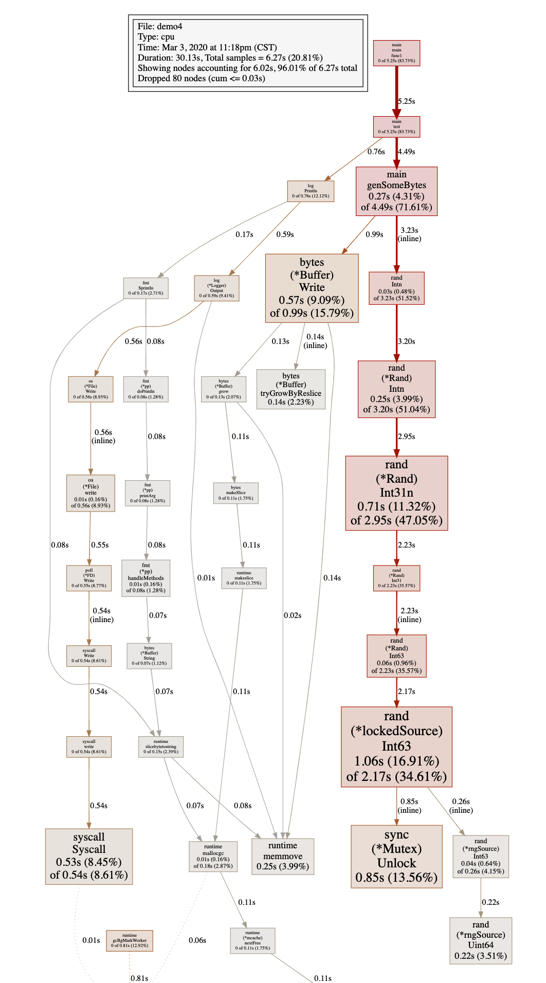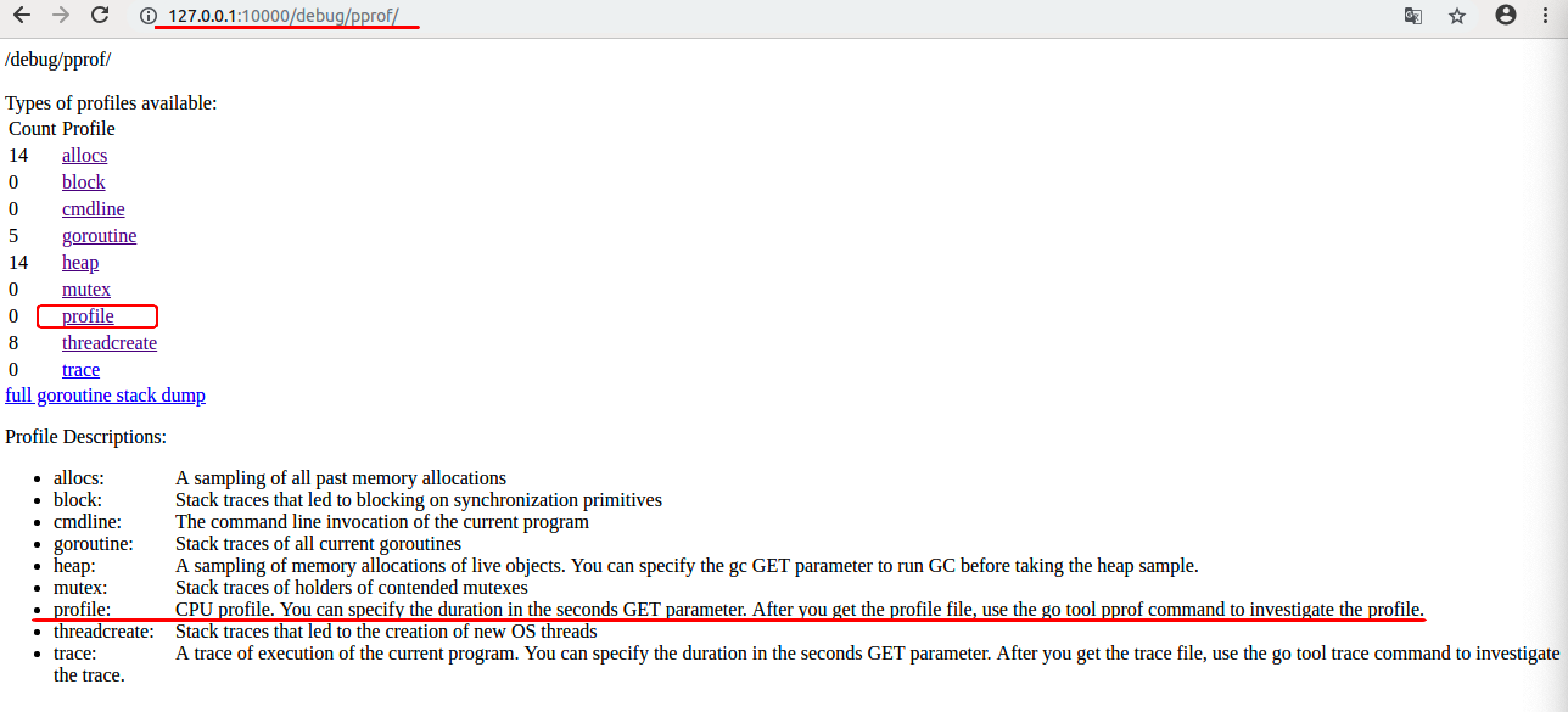 # 1、最常用的调试 golang 的 bug 以及性能问题的实践方法? > 本节为**重点**章节 ## 场景1: 如何分析程序的运行时间与CPU利用率情况? ### (1) shell内置time指令 这个方法不算新颖,但是确很实用。 `time`是Unix/Linux内置多命令,使用时一般不用传过多参数,直接跟上需要调试多程序即可。 ```bash $ time go run test2.go &{{0 0} 张三 0} real 0m0.843s user 0m0.216s sys 0m0.389s ``` 上面是使用time对 `go run test2.go`对执行程序坐了性能分析,得到3个指标。 - `real`:从程序开始到结束,实际度过的时间; - `user`:程序在**用户态**度过的时间; - `sys`:程序在**内核态**度过的时间。 一般情况下 `real` **>=** `user` + `sys`,因为系统还有其它进程(切换其他进程中间对于本进程会有空白期)。 ### (2) /usr/bin/time指令 这个指令比内置的time更加详细一些,使用的时候需要用绝对路径,而且要加上参数`-v ` ```bash $ /usr/bin/time -v go run test2.go Command being timed: "go run test2.go" User time (seconds): 0.12 System time (seconds): 0.06 Percent of CPU this job got: 115% Elapsed (wall clock) time (h:mm:ss or m:ss): 0:00.16 Average shared text size (kbytes): 0 Average unshared data size (kbytes): 0 Average stack size (kbytes): 0 Average total size (kbytes): 0 Maximum resident set size (kbytes): 41172 Average resident set size (kbytes): 0 Major (requiring I/O) page faults: 1 Minor (reclaiming a frame) page faults: 15880 Voluntary context switches: 897 Involuntary context switches: 183 Swaps: 0 File system inputs: 256 File system outputs: 2664 Socket messages sent: 0 Socket messages received: 0 Signals delivered: 0 Page size (bytes): 4096 Exit status: 0 ``` 可以看到这里的功能要强大多了,除了之前的信息外,还包括了: - CPU占用率; - 内存使用情况; - Page Fault 情况; - 进程切换情况; - 文件系统IO; - Socket 使用情况; - …… ## 场景2: 如何分析golang程序的内存使用情况? ### (1) 内存占用情况查看 我们先写一段demo例子代码 ```go package main import ( "log" "runtime" "time" ) func test() { //slice 会动态扩容,用slice来做堆内存申请 container := make([]int, 8) log.Println(" ===> loop begin.") for i := 0; i < 32*1000*1000; i++ { container = append(container, i) } log.Println(" ===> loop end.") } func main() { log.Println("Start.") test() log.Println("force gc.") runtime.GC() //强制调用gc回收 log.Println("Done.") time.Sleep(3600 * time.Second) //睡眠,保持程序不退出 } ``` 编译 ```bash $go build -o snippet_mem && ./snippet_mem ``` 然后在./snippet_mem进程没有执行完,我们再开一个窗口,通过`top`命令查看进程的内存占用情况 ```bash $top -p $(pidof snippet_mem) ``` 得到结果如下:  我们看出来,没有退出的snippet_mem进程有约830m的内存被占用。 直观上来说,这个程序在`test()`函数执行完后,切片`contaner`的内存应该被释放,不应该占用830M那么大。 下面让我们使用GODEBUG来分析程序的内存使用情况。 --- ### (2) GODEBUG与gctrace **用法** 执行`snippet_mem`程序之前添加环境变量`GODEBUG='gctrace=1'`来跟踪打印垃圾回收器信息 ```bash $ GODEBUG='gctrace=1' ./snippet_mem ``` 设置`gctrace=1`会使得垃圾回收器在每次回收时汇总所回收内存的大小以及耗时, 并将这些内容汇总成单行内容打印到标准错误输出中。 **格式** ``` gc # @#s #%: #+#+# ms clock, #+#/#/#+# ms cpu, #->#-># MB, # MB goal, # P ``` 含义 ``` gc # GC次数的编号,每次GC时递增 @#s 距离程序开始执行时的时间 #% GC占用的执行时间百分比 #+...+# GC使用的时间 #->#-># MB GC开始,结束,以及当前活跃堆内存的大小,单位M # MB goal 全局堆内存大小 # P 使用processor的数量 ``` 如果每条信息最后,以`(forced)`结尾,那么该信息是由`runtime.GC()`调用触发 我们来选择其中一行来解释一下: ```bash gc 17 @0.149s 1%: 0.004+36+0.003 ms clock, 0.009+0/0.051/36+0.006 ms cpu, 181->181->101 MB, 182 MB goal, 2 P ``` 该条信息含义如下: * `gc 17`: Gc 调试编号为17 * `@0.149s`:此时程序已经执行了0.149s * `1%`: 0.149s中其中gc模块占用了1%的时间 * `0.004+36+0.003 ms clock`: 垃圾回收的时间,分别为STW(stop-the-world)清扫的时间+并发标记和扫描的时间+STW标记的时间 * `0.009+0/0.051/36+0.006 ms cpu`: 垃圾回收占用cpu时间 * `181->181->101 MB`: GC开始前堆内存181M, GC结束后堆内存181M,当前活跃的堆内存101M * `182 MB goal`: 全局堆内存大小 * `2 P`: 本次GC使用了2个P(调度器中的Processer) --- 了解了GC的调试信息读法后,接下来我们来分析一下本次GC的结果。 我们还是执行GODEBUG调试 ```bash $ GODEBUG='gctrace=1' ./snippet_mem ``` 结果如下 ```bash 2020/03/02 11:22:37 Start. 2020/03/02 11:22:37 ===> loop begin. gc 1 @0.002s 5%: 0.14+0.45+0.002 ms clock, 0.29+0/0.042/0.33+0.005 ms cpu, 4->4->0 MB, 5 MB goal, 2 P gc 2 @0.003s 4%: 0.13+3.7+0.019 ms clock, 0.27+0/0.037/2.8+0.038 ms cpu, 4->4->2 MB, 5 MB goal, 2 P gc 3 @0.008s 3%: 0.002+1.1+0.001 ms clock, 0.005+0/0.083/1.0+0.003 ms cpu, 6->6->2 MB, 7 MB goal, 2 P gc 4 @0.010s 3%: 0.003+0.99+0.002 ms clock, 0.006+0/0.041/0.82+0.004 ms cpu, 5->5->2 MB, 6 MB goal, 2 P gc 5 @0.011s 4%: 0.079+0.80+0.003 ms clock, 0.15+0/0.046/0.51+0.006 ms cpu, 6->6->3 MB, 7 MB goal, 2 P gc 6 @0.013s 4%: 0.15+3.7+0.002 ms clock, 0.31+0/0.061/3.3+0.005 ms cpu, 8->8->8 MB, 9 MB goal, 2 P gc 7 @0.019s 3%: 0.004+2.5+0.005 ms clock, 0.008+0/0.051/2.1+0.010 ms cpu, 20->20->6 MB, 21 MB goal, 2 P gc 8 @0.023s 5%: 0.014+3.7+0.002 ms clock, 0.029+0.040/1.2/0+0.005 ms cpu, 15->15->8 MB, 16 MB goal, 2 P gc 9 @0.031s 4%: 0.003+1.6+0.001 ms clock, 0.007+0.094/0/0+0.003 ms cpu, 19->19->10 MB, 20 MB goal, 2 P gc 10 @0.034s 3%: 0.006+5.2+0.004 ms clock, 0.013+0/0.045/5.0+0.008 ms cpu, 24->24->13 MB, 25 MB goal, 2 P gc 11 @0.040s 3%: 0.12+2.6+0.002 ms clock, 0.24+0