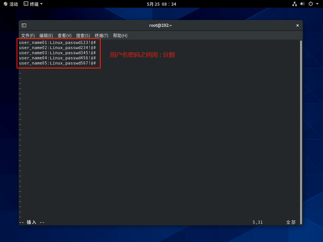 前面小节介绍了如何添加 Linux 系统用户、删除 Linux 系统用户,本小节介绍如何修改 Linux 系统用户相关的信息。 1\. 用户修改相关命令 ------------ 下面列举了一些修改用户信息相关的命令: | 命令名称 | 功能与作用描述 | | :-- | :-- | | usermod | 修改用户的字段值,并且可以指定用户的组和其他所属的关系 | | passwd | 修改已经存在的用户的密码 | | chpasswd | 读取文件中登录名密码对,更新密码 | | chage | 修改用户密码过期日期 | | chfn | 修改用户的备注信息 | | chsh | 修改用户默认登录的 shell | 2\. usermod 修改用户信息 ------------------ ### 2.1 usermod 命令参数介绍 下面列举了一些 `usermod` 命令参数作用: | usermod 命令参数名称 | 功能与作用描述 | | :-- | :-- | | \-l | 修改用户的登录名 | | \-L | 禁止指定用户登录 | | \-p | 将加密过的密码 (PASSWORD) 设为新密码 | | \-U | 使禁用的用户能够登录 | ### 2.2 修改用户名 下面演示一下 `-l` 命令如下: usermod -l new_user3 user3 下面演示一下 `-L`锁定用户, 命令如下: usermod -L user2 下面演示一下 `-U`解锁用户, 命令如下: usermod -U user2 3\. 修改密码 -------- ### 3.1 passwd 修改密码 为了下面演示方便,使用 `useradd` 新增几个用户,并使用 `passwd` 命令修改这些新增用户的密码,命令如下: useradd user_name01 passwd user_name01 useradd user_name02 passwd user_name02 useradd user_name03 passwd user_name03 useradd user_name04 passwd user_name04 ### 3.2 chpasswd 批量修改密码 首先使用 `vim` 命令新建好批量需要修改的用户名密码对,命令如下: vim /home/user_pwd.txt  使用 `chpasswd` 命令批量修改用户的密码,命令如下: chpasswd < /home/user_pwd.txt 4\. 修改用户默认 shell ---------------- 这里以 `user_name01` 用户为例,修改其默认 `shell` 查看当前系统可用登录shell: ```bash magento@/home$ cat /etc/shells # /etc/shells: valid login shells /bin/sh /bin/bash /usr/bin/bash /bin/rbash /usr/bin/rbash /bin/dash /usr/bin/dash magento@/home$ echo $SHELL /bin/bash ``` 查看当前用户使用的shell: ```bash magento@/home$ echo $SHELL /bin/bash ``` 修改user_name01的默认shell: cat /etc/shells chsh -s /bin/sh user_name01 5.修改用户备注 -------- ### 5.1 chfn 修改用户备注信息 可以给用户备注 `名称`、`办公`、`办公电话`、`住宅电话`,命令如下: su root chfn user_name01 ### 5.2 查看用户备注信息 可以在 `/etc/passwd` 文件查看上述备注的用户信息,命令如下: grep user_name02 /etc/passwd 6\. 用户有效期 --------- ### 6.1 chage 命令 下面列举了一些 `chage` 命令参数作用: | chage 命令参数名称 | 功能与作用描述 | | :-- | :-- | | \-d | 表示 `--lastday 最近日期`,将最近一次密码设置时间设为 `最近日期` | | \-E | 表示 `--expiredate 过期日期`,将帐户过期时间设为 `过期日期` | | \-I | 表示 `--inactive INACTIVE`,过期 INACTIVE 天数后,设定密码为失效状态 | | \-l | 表示 `--list`,显示帐户年龄信息 | | \-m | 表示 `--mindays 最小天数`,将两次改变密码之间相距的最小天数设为 `最小天数` | | \-W | 表示 `--warndays 警告天数`,将过期警告天数设为 `警告天数` | ### 6.2 设置密码过期的日期 使用 `chage -E` 可以设置用户过期日期,命令如下: grep user_name02 /etc/shadow chage -E 2020-05-30 user_name02 grep user_name02 /etc/shadow 7\. 小结 ------ 本小节介绍了修改用户相关信息的命令,其中 `usermod` 命令配合参数可以修改用户的用户名,`passwd` 命令可以修改单个用户密码,`chpasswd` 命令可以批量修改文件中列表出来的用户密码,`chsh` 命令可以修改用户默认登录使用的 `shell`,`chfn` 命令可以修改用户的备注信息,`chage` 命令可以修改用户过期天数相关的配置。
