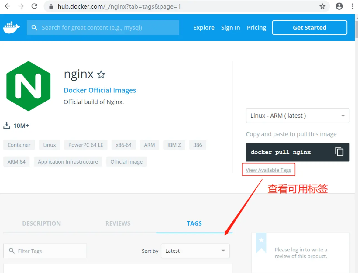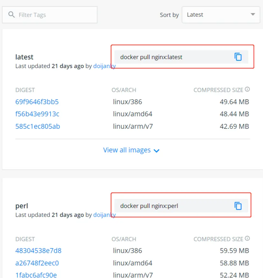 Nginx 是一个高性能的 HTTP 和反向代理 web 服务器,同时也提供了 IMAP/POP3/SMTP 服务 。 ### 1、查看可用的 Nginx 版本 访问 Nginx 镜像库地址:[https://hub.docker.com/\_/nginx?tab=tags](https://hub.docker.com/_/nginx?tab=tags)。 可以通过 Sort by 查看其他版本的 Nginx,默认是最新版本**nginx:latest**。  你也可以在下拉列表中找到其他你想要的版本:  此外,我们还可以用docker search nginx命令来查看可用版本: $ docker search nginx NAME DESCRIPTION STARS OFFICIAL AUTOMATED nginx Official build of Nginx. 3260 [OK] jwilder/nginx-proxy Automated Nginx reverse proxy for docker c... 674 [OK] richarvey/nginx-php-fpm Container running Nginx + PHP-FPM capable ... 207 [OK] million12/nginx-php Nginx + PHP-FPM 5.5, 5.6, 7.0 (NG), CentOS... 67 [OK] maxexcloo/nginx-php Docker framework container with Nginx and ... 57 [OK] ... ### 2、取最新版的 Nginx 镜像 这里我们拉取官方的最新版本的镜像: $ docker pull nginx:latest  ### 3、查看本地镜像 使用以下命令来查看是否已安装了 nginx: $ docker images  在上图中可以看到我们已经安装了最新版本(latest)的 nginx 镜像。 ### 4、运行容器 安装完成后,我们可以使用以下命令来运行 nginx 容器: $ docker run --name nginx-test -p 8080:80 -d nginx 参数说明: * **\--name nginx-test**:容器名称。 * **\-p 8080:80**: 端口进行映射,将本地 8080 端口映射到容器内部的 80 端口。 * **\-d nginx**: 设置容器在在后台一直运行。  ### 5、安装成功 最后我们可以通过浏览器可以直接访问 8080 端口的 nginx 服务: