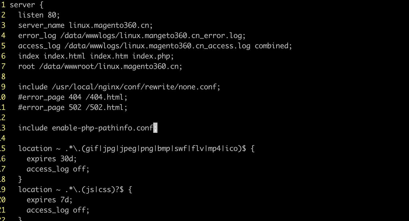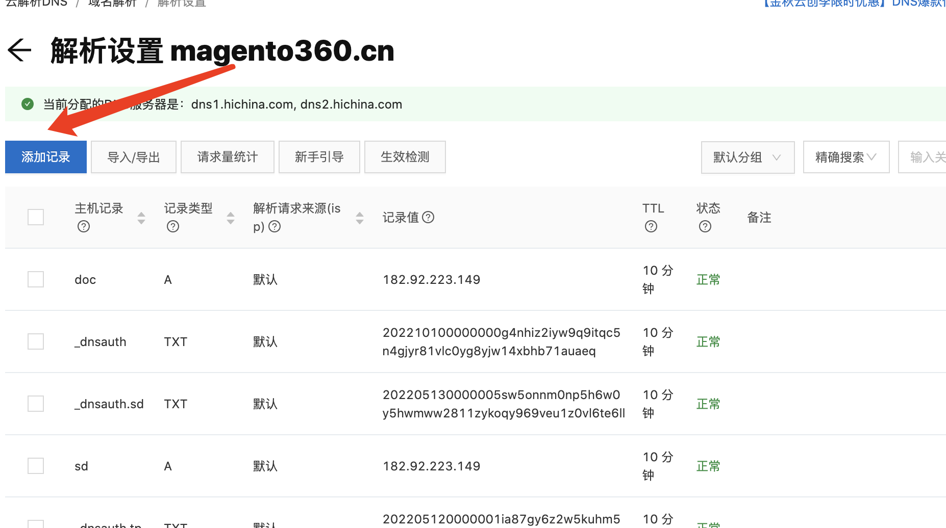**域名解析** 当购买完域名后,我们就可以给该域名添加解析。 在域名解析前,需要先有一台服务器,并且该服务器有公网ip。 就可以将某个域名,解析到该服务器对应的ip。  在后面的课程中会为大家介绍,如果购买云服务器。 ------------ **添加一条记录** 我们以magento360.cn这个域名为例,为它添加一条域名解析记录。 设置好后保存。 在域名解析列表中可以看到我们新添加的解析记录。。  这个时候我们的域名就可以使用了。 ------------ **测试域名解析** 打开命令行,使用ping命令测试刚刚添加的域名解析记录。 输入 ping linux.magento360.cn  可以看到命令输出结果能正常返回ttl时间,代表域名解析成功。 ------------ **浏览器访问测试** 在浏览器中输入linux.magento360.cn  可以看到返回了403. 由于我们的服务器已经运行了Nginx,因此,该域名的访问可以成功到达服务器,并且由Nginx监听了80端口响应了该请求。 但是,在Nginx服务器中,还没有配置对应的Server,因此,Nginx给我们返回了403. ------------ **Nginx添加Server** 我们找到nginx的配置文件,为新添加的域名配置一条server.  接下来我们添加测试网页: data/wwwroot/linux.magento360.cn/index.html  再次在浏览器输入linux.magento360.cn测试:  如果是乱码,是因为我们的html写的不够规范,为了方便测试,我们在上面简单的添加上网页编码,这样中文就不会乱码了: ```html <meta http-equiv=Content-Type content="text/html;charset=utf-8"> ``` **小结:** 当我们在阿里云购买了域名后,就可以为该域名添加多个二级子域名,除了购买时,域名收费,后续我们添加的二级域名是免费的。添加域名解析的流程是:先添加一条A记录,解析到指定服务器的ip,然后在该服务器安装Web服务,如Nginx,Apache,添加Server,监听对应的域名,我们的域名就可以正常使用了。