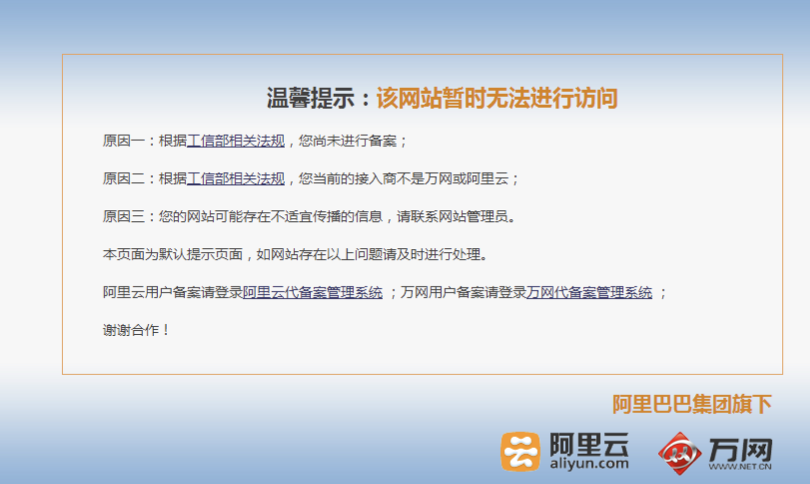 **域名备案** 域名备案相当于将你购买的域名在工信部作一个备案登记。 什么样的域名需要备案? 什么样的域名不需要备案? 域名是否需要备案,并不是域名本身决定的,而是你的域名解析到的服务器的ip来决定的。 如果你的域名解析的服务器ip是境内的,那么,对应的域名就需要备案。 如果你购买的是国外的服务器,并且域名解析到了国外服务器的ip,那么,这种情况下,域名是不需要备案的。 ------------ **域名不备案有什么后果**? 如果你的域名需要备案(国内ip),但没有备案,这会导致你的网站被关闭,并且域名无法访问。  ------------ **域名备案的流程** 如果你是在阿里云购买的域名和服务器,那么,备案流程非常方便,全程只需要线上操作即可。 你只需要按照要求填写好域名备案信息,由阿里云将你的备案信息上传到工信部,等待备案审核结果即可。 如果是在其它域名供应商购买的域名,则需要咨询该供应商对应的域名备案流程。 ------------ **阿里云域名备案**  在阿里云的备案控制台,点击开始备案,进入到阿里云代备案系统:  接下来,我们只需要选择对应的域名,填写相应的域名备案信息,上传指定材料后,提交备案信息,等待备案结果即可。 通常,阿里云域名备案会在15天到1个月内完成。 ------------ **小结:** - 如果域名指向了国内服务器ip,则该域名必须备案。 - 如果域名指向的是国外服务器ip,则该域名无须备案。 - 如果购买的阿里云域名和服务器,使用阿里云的域名代备案系统,将十分方便。 - 有了域名,并且该域名通过备案,以后,我们的域名就可以正常访问了,将不会面临被关闭的风险。