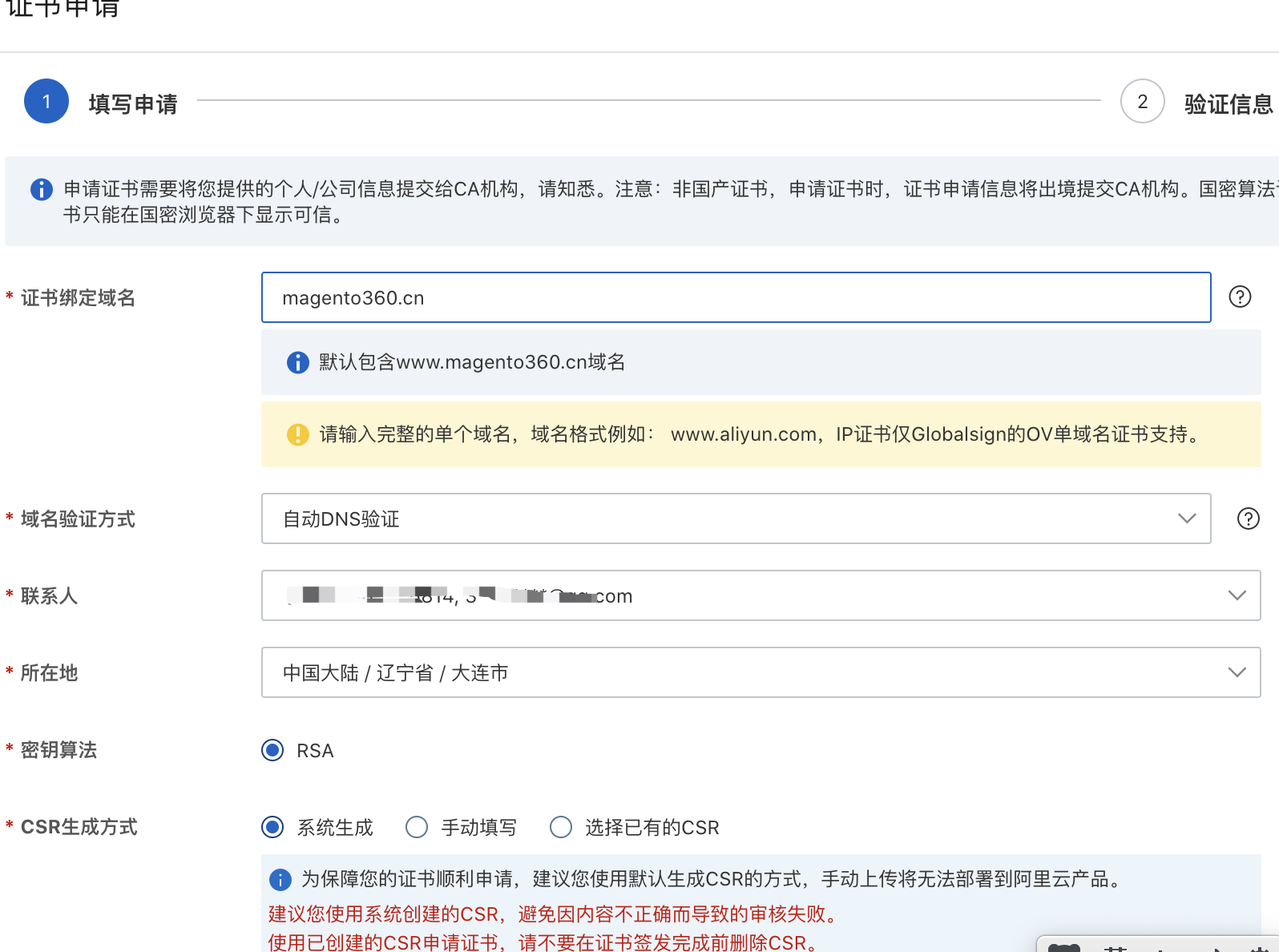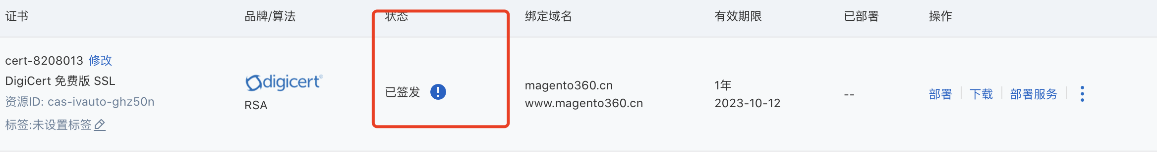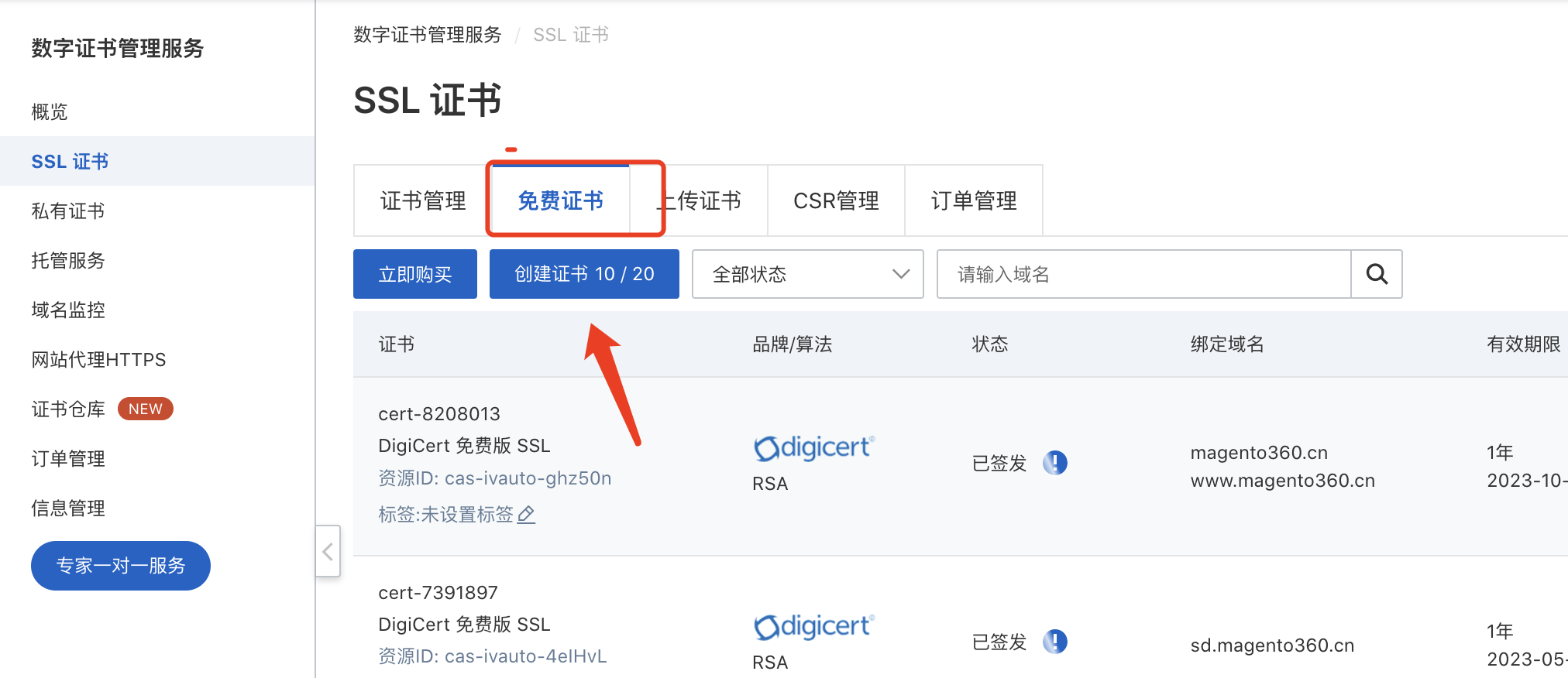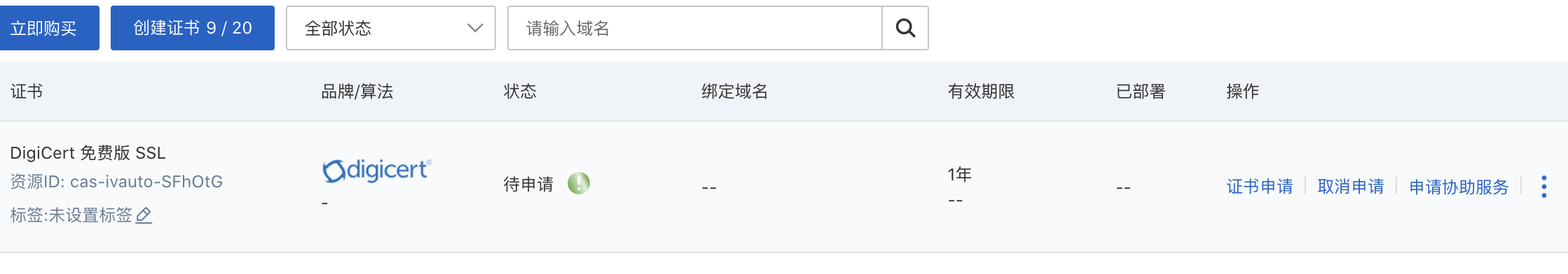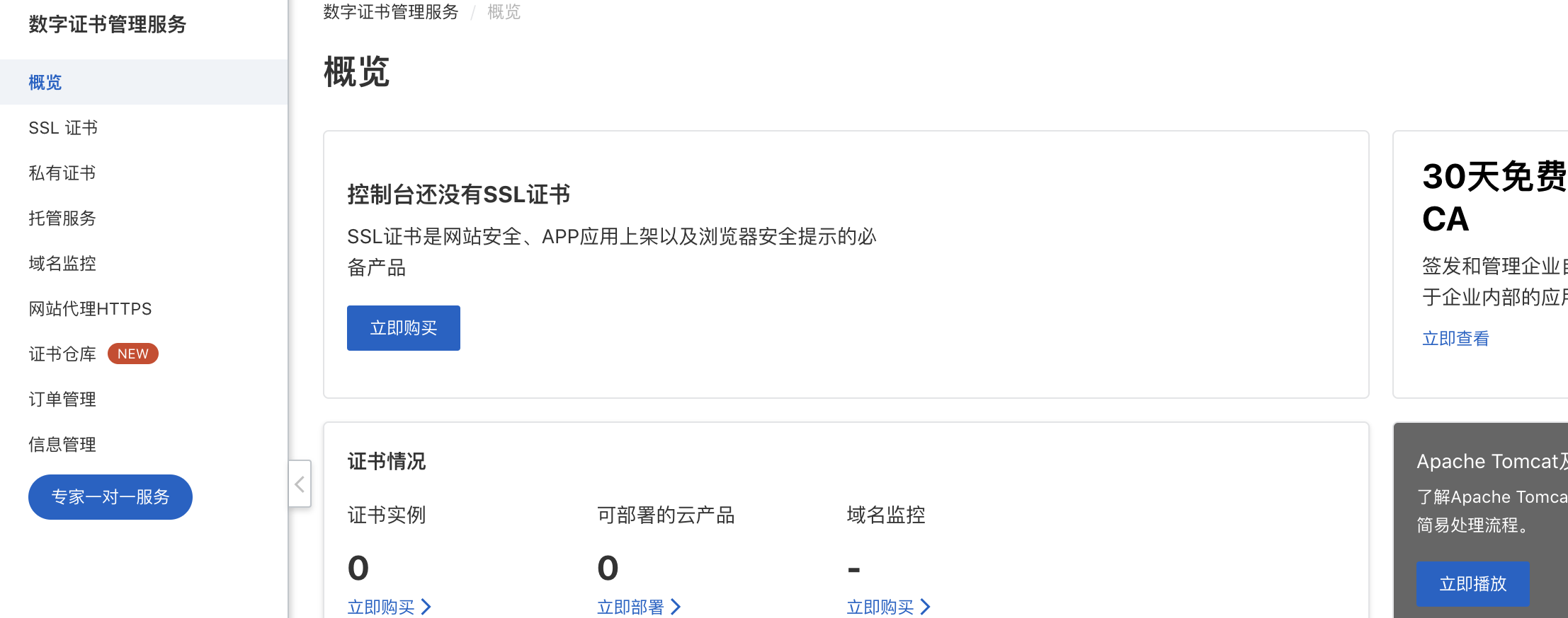 **ssl服务** SSL代表安全层,用于加密通信过程中正在发送/接收的数据,检查它是否真的是SSL可以通过以下两点。 1.在浏览器中输入的网站的URL地址以https开头 2.浏览器的URL地址输入字段旁边出现一个关键标记 ------------ **ssl证书购买** 在前面的小节里,我们购买了域名和服务器。 如果想让我们的域名可以通过https访问,就需要购买证书。 我们在阿里云控制台输入ssl,找到数字证书管理服务。  **购买免费证书** 点击立即购买 选择免费证书:  可以看到,免费的证书最多支持创建数量为20个。 **创建证书** 点击创建证书:  会为我们创建一条证书记录,点击申请  填写完证书申请相关信息,包括域名,域名验证方式等。 申请完,提交给阿里云,阿里云会把这条证书申请提交到上层的证书机构处理。 **部署证书** 证书申请成功后,状态一栏会显示:已签发  我们可以把证书下载下来,是一个zip包文件,里面有两个key文件,这两个文件就是我们要使用的证书文件。 如果我们的服务器用的是Nginx服务器,在nginx配置文件中配置上ssl服务的监听端口,及证书的位置,即可。 下面是nginx的一段配置示例: 指定nginx监听443端口:  指定证书的.pem文件和.key文件  最后,不要忘记在ecs服务器的安全组里面打开443端口,否则默认的安全组规则是拒绝443端口访问的。