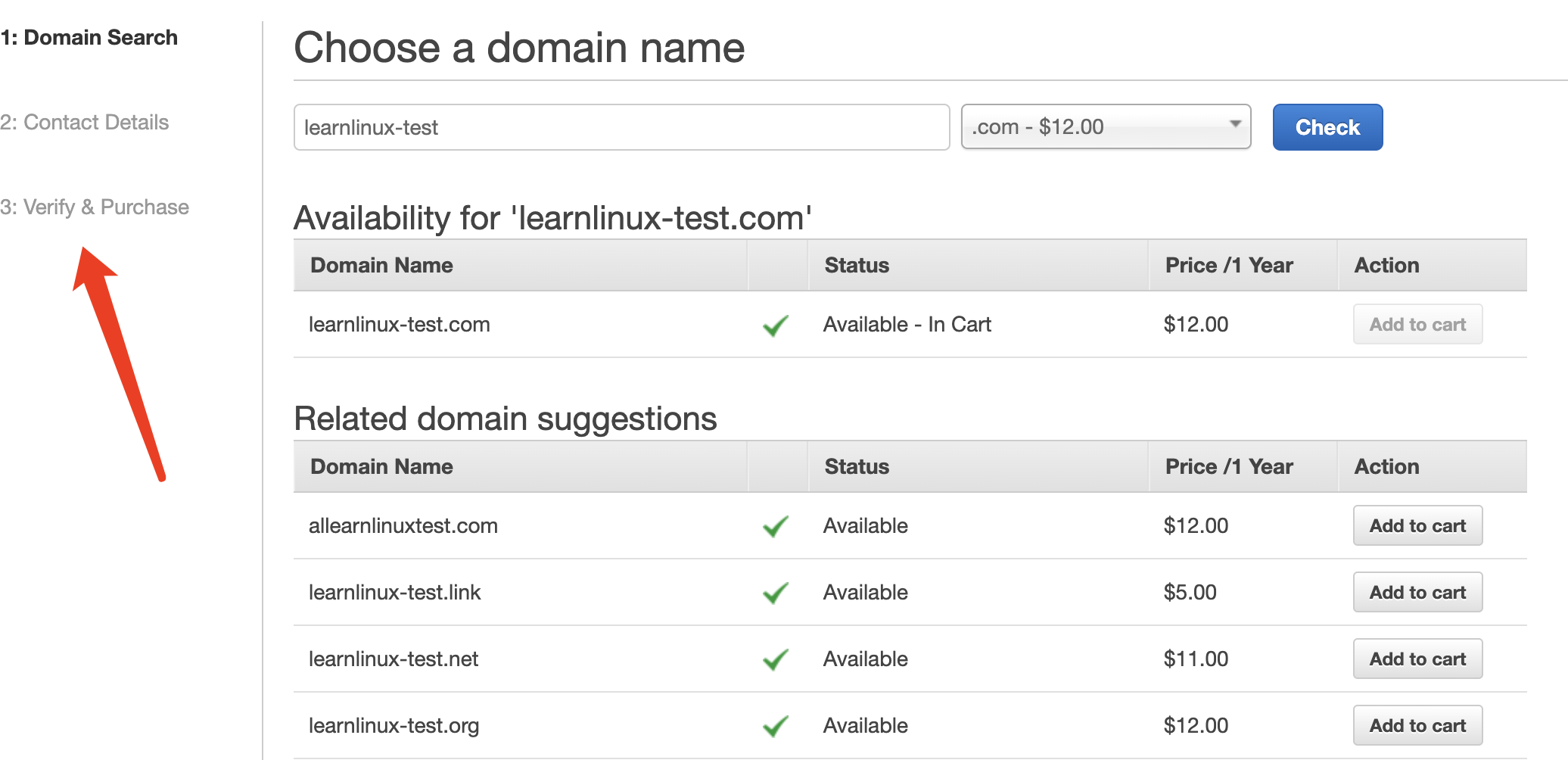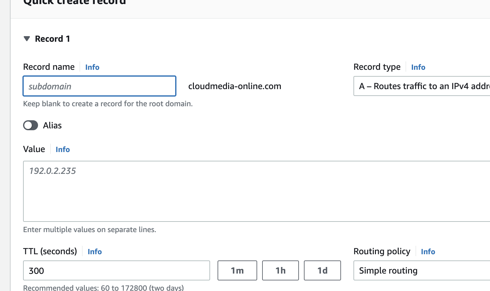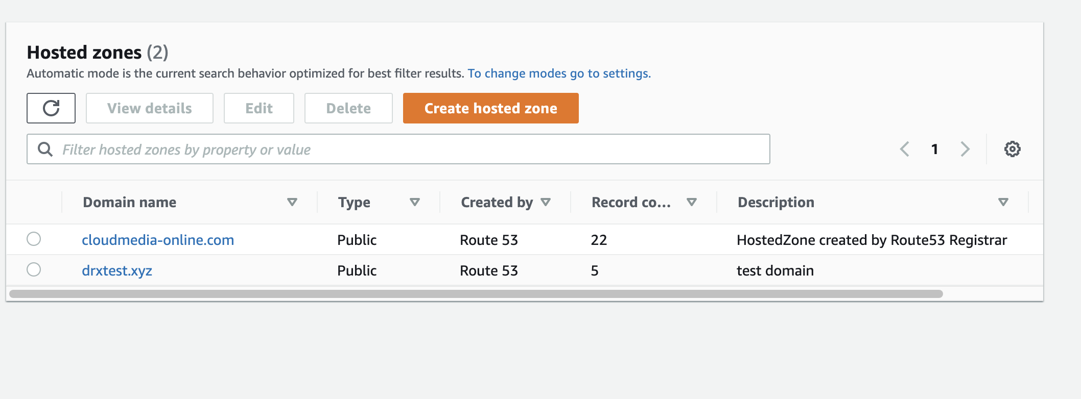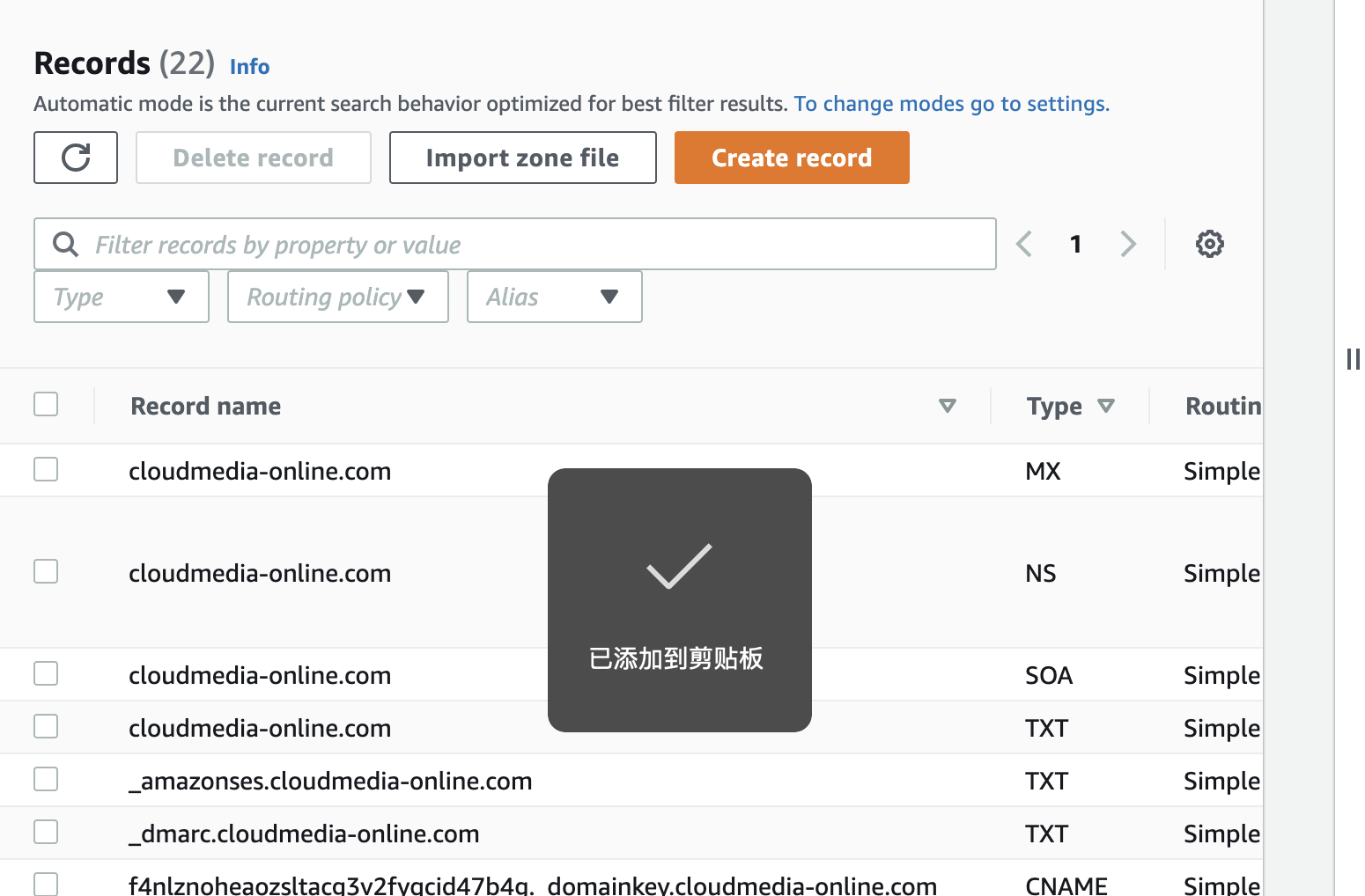 **Route 53介绍** Amazon Route 53 是一种可用性高、可扩展性强的域名系统 (DNS) Web 服务。Route53服务和阿里云的万网域名服务没有本质上的差别。 ------------ **域名注册** 登录到域名控制台,搜索域名注册。  ------------ **购买域名** 搜索结果列表会为我们展示当前可购买的域名:  域名注册一共需要执行三个步骤: 1.搜索域名 2.添加联系人信息 3.支付 ------------ **查看域名** 域名购买成功后,点击域名控制台的HostZones,可以看到已拥有的域名列表:  ------------ **域名解析:** 点击一个域名,显示的列表为该域名添加的解析列表:  我们可以为该域名添加一条新的解析,点击Create Record,为该域名添加解析:  这里添加域名解析的流程和前面介绍过的阿里云流程基本一致,不过多介绍。