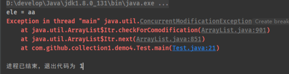 - 异常的产生原因:在迭代器遍历集合的过程中,调用集合自身的功能(例如:调用集合的 add 和 remove 方法),改变集合的长度。 - 示例:并发修改异常 ``` package com.github.collection1.demo4; import java.util.ArrayList; import java.util.Collection; import java.util.Iterator; /** * @author maxiaoke.com * @version 1.0 */ public class Test { public static void main(String[] args) { Collection<String> collection = new ArrayList<>(); collection.add("aa"); collection.add("bb"); collection.add("cc"); collection.add("dd"); for (Iterator<String> iterator = collection.iterator(); iterator.hasNext();) { String ele = iterator.next(); System.out.println("ele = " + ele); collection.add("ee"); } } } ```  - 如果在 Iterator、ListIterator 迭代器创建后的任意时间从结构上修改了集合(通过迭代器自身的remove或add方法之外的任何其他方式),则迭代器会抛出 ConcurrentModificationException 异常。因此,面对并发的修改,迭代器很快会失败,而不是冒着在将来不确定的时间发生不确定行为的风险。 - 这样设计时因此,迭代器代表集合中的某个元素的位置,内部会存储某些能够代表该位置的信息。当集合发生改变的时候,该信息的含义可能会发生变化,这个时候操作迭代器就有可能造成不可预料的后果。因此,果断抛出异常阻止,是最好的方法,者就是 Iterator 迭代器的快速失败机制。 - 需要注意的是,迭代器的快速失败机制行文不能得到保证,一般来说,存在不同步的并发修改时,不可能做出任何坚决的保证。快速失败机制尽最大努力抛出 ConcurrentModificationException 。因此,迭代器的快速失败行文应该仅仅用于检测bug 。 - 快速失败机制的实现原理: ○ ① 在 ArrayList 等集合类中都有一个 modCount 变量,它用来记录集合的结构被修改的次数。 ○ ② 当我们给集合添加或删除元素的时候,会导致 modCount++ 。 ○ ③ 当我们使用 Iterator 迭代器遍历集合的时候,会使用一个变量记录当前集合的 modCount 。例如:int expectedModCount = modCount;,并且,在迭代器每次 next() 迭代元素的时候,都要检查 expectedModCount != modCount ,如果不相等,则说明调用了 Iterator 迭代器以外的 Collection 的 add 、remove 等方法,修改了集合的结构,使得 modCount++ ,值变了,就会抛出 ConcurrentModificationException 。