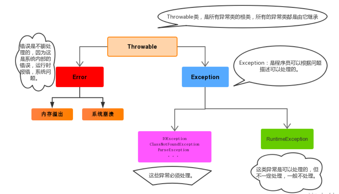 - 异常的根类是 java.lang.Throwable ,其下有两个子类:java.lang.Error 和 java.lang.Exception ,平常我们所说的异常一般都是指java.lang.Exception 。  - Throwable 体系: - Error :严重错误,无法处理的错误,只能事先避免 - 例如:StackOverflowError 、OOM( OutOfMemoryError )、内存泄漏( Memory Leak )。 - 内存溢出( OOM ):是指应用程序中存在无法回收的内存或者使用的内存过多,最终是的程序运行用到的内存大于要提供的最大内存。 - 内存泄露( Memory Leak ):是指程序中已经动态分配的堆内存由于某种原因没有来得及释放或无法释放,造成一系统内存的浪费,导致程序运行速度减慢甚至导致系统崩溃等严重后果。 - Exception :表示异常,其它因编程错误或偶然的外在因素导致的一般性问题,程序员可以通过代码的方式纠正,使得程序继续运行。 - 例如:NullPointerException 、FileNotFoundException 等。 - Throwable 中的常用方法: - 打印异常的详细信息: ```bash public void printStackTrace() ``` - 获取发生异常的原因: ```bash public String getMessage() ```