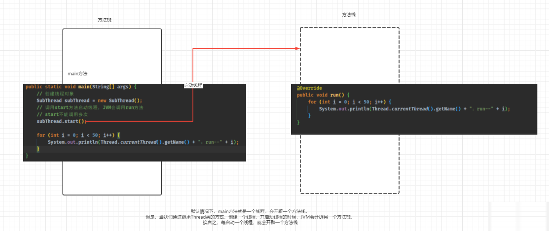● 步骤: - ① 定义子类继承 Thread 类。 - ② 子类中重写 Thread 类中的 run 方法。 - ③ 创建 Thread 子类对象,即创建了线程对象。。 - ④ 调用线程对象 start 方法:启动线程,调用 run 方法。 注意事项: ● ① 如果自己手动调用 run() 方法,那么就只是普通方法,没有启动多线程模式。 ● ② run() 方法由 JVM 调用,什么时候调用,执行的过程控制都有操作系统的 CPU 调度决定。 ● ③ 想要启动多线程,必须调用 start 方法。 ● ④ 一个线程对象只能调用一次 start() 方法启动,如果重复调用了,则将抛出以上的异常 IllegalThreadStateException 。 ● 示例: ```bash package com.github.thread.demo1; /** * 继承Thread类并重写run方法的方式创建线程类 * * @author maxiaoke.com * @version 1.0 * */ public class SubThread extends Thread { @Override public void run() { for (int i = 0; i < 50; i++) { System.out.println(Thread.currentThread().getName() + ":run--" + i); } } } ``` ```bash package com.github.thread.demo1; /** * @author maxiaoke.com * @version 1.0 * */ public class Test { public static void main(String[] args) { // 创建线程对象 SubThread subThread = new SubThread(); // 调用start方法启动线程,JVM会调用run方法 // start不能调用多次 subThread.start(); for (int i = 0; i < 50; i++) { System.out.println(Thread.currentThread().getName() + ":run--" + i); } } } ```