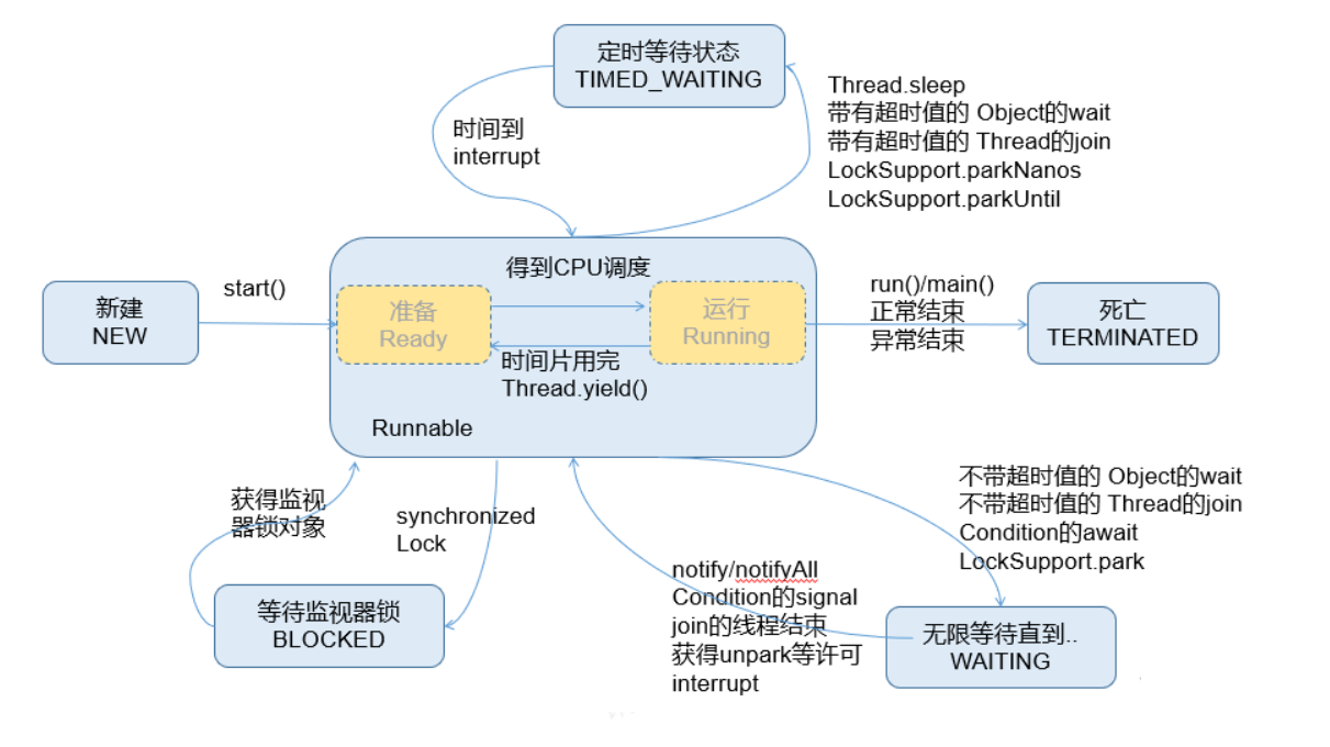 在 java.lang.Thread.State 的枚举类中这样定义: ```bash public enum State { NEW, RUNNABLE, BLOCKED, WAITING, TIMED_WAITING, TERMINATED; } ``` - 首先它没有区分:就绪和运行状态,因为对于 Java 对象来说,只能标记为可运行,至于什么时候运行,不是 JVM 来控制的了,是 OS 来进行调度的,而且时间非常短暂,因此对于 Java 对象的状态来说,无法区分。只能我们人为的进行想象和理解。 - 其次根据 Thread.State 的定义,阻塞状态是分为三种的:BLOCKED 、WAITING 、TIMED_WAITING 。 - BLOCKED :是指互有竞争关系的几个线程,其中一个线程占有锁对象时,其他线程只能等待锁。只有获得锁对象的线程才能有执行机会。 - TIMED_WAITING :当前线程执行过程中遇到 Thread 类的 sleep 或 join ,Object 类的 wait ,LockSupport 类的 park 方法,并且在调用这些方法时,设置了时间,那么当前线程会进入TIMED_WAITING ,直到时间到,或被中断。 - WAITING :当前线程执行过程中遇到遇到 Object 类的 wait ,Thread 类的 join ,LockSupport 类的 park 方法,并且在调用这些方法时,没有指定时间,那么当前线程会进入 WAITING 状态,直到被唤醒。 ■ 通过 Object 类的 wait 进入 WAITING 状态的要有 Object 的 notify/notifyAll 唤醒。 ■ 通过 Condition 的 await 进入WAITING 状态的要有 Conditon 的 signal 方法唤醒。 ■ 通过 LockSupport 类的park方法进入 WAITING 状态的要有 LockSupport 类的 unpark 方法唤醒。 ■ 通过 Thread 类的 join 进入WAITING 状态,只有调用 join 方法的线程对象结束才能让当前线程恢复。 - 说明:当从 WAITING 或 TIMED_WAITING 恢复到 Runnable 状态时,如果发现当前线程没有得到监视器锁,那么会立刻转入 BLOCKED 状态。