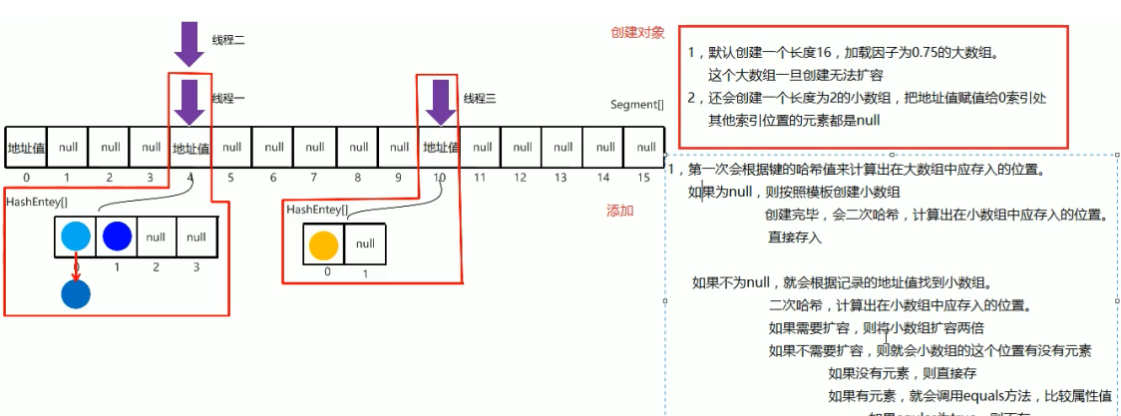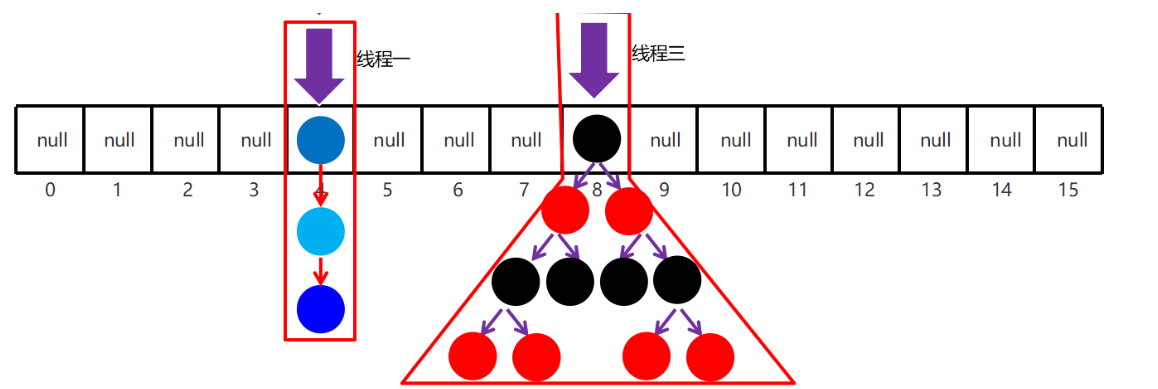 - ConcurrentHashMap出现的原因 :在集合类中的 HashMap 是比较常用的集合对象,但是 HashMap 是线程不安全的,为了保证线程安全,我们可以使用 Hashtable ,但是 Hashtable 的效率很低。 - 基于上面的两个原因,JDK 5 提供了 ConcurrentHashMap 。  - ConcurrentHashMap 在 JDK 7 和 JDK 8 中的原理不一样。 - ConcurrentHashMap 在 JDK 7 中的原理:  - ConcurrentHashMap 在 JDK 8 中的原理: - 底层结构:数组 + 链表 + 红黑树。 - 结合 CAS 机制 + synchronized 同步代码块形式保证线程安全。  ConcurrentHashMap 在 JDK 8 中的原理: - 如果使用空参构造创建 ConcurrentHashMap 对象,则什么事情都不做。在第一次添加元素的时候创建哈希表。 - 计算当前元素应存入的索引。 - 如果该索引位置为 null ,则利用 cas 算法,将本结点添加到数组中。 - 如果该索引位置不为 null ,则利用 volatile 关键字获得当前位置最新的结点地址,挂在他下面,变成链表。 - 当链表的长度大于等于 8 时,自动转换成红黑树。 - 以链表或者红黑树头结点为锁对象,配合悲观锁保证多线程操作集合时数据的安全性。 - 示例: ```bash package com.github.demo18; import java.util.Map; import java.util.concurrent.ConcurrentHashMap; /** * @author maxiaoke.com * @version 1.0 */ public class Test { public static void main(String[] args) { Map<String, String> map = new ConcurrentHashMap<>(); Thread t1 = new Thread(() -> { for (int i = 0; i < 25; i++) { map.put(String.valueOf(i), String.valueOf(i)); } }); Thread t2 = new Thread(() -> { for (int i = 25; i < 51; i++) { map.put(String.valueOf(i), String.valueOf(i)); } }); t1.start(); t2.start(); System.out.println("---------------------------------------------"); try { Thread.sleep(1000); } catch (InterruptedException e) { e.printStackTrace(); } for (int i = 0; i < 51; i++) { System.out.println(map.get(String.valueOf(i))); } } } ```