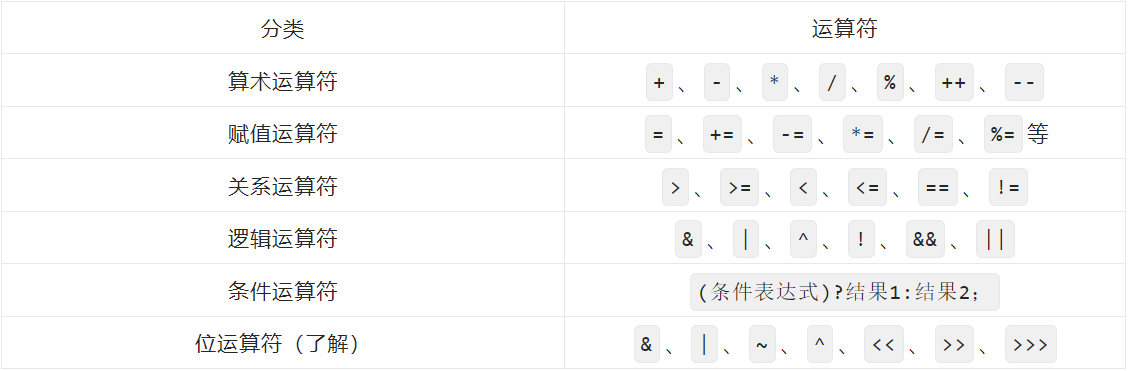 - 表达式:用运算符连接起来的式子。 - 运算符的分类: - 按照功能分为:算术运算符、赋值运算符、比较运算符、逻辑运算符、条件运算符……  - 按照操作数个数分为:一元运算符(单目运算符)、二元运算符(双目运算符)、三元运算符(三目运算符) - 一元运算符:操作数只有一个 ● 例如: - 正号(+):+a - 负号(-):-a - 自增(++):++i - 逻辑非:!true - 二元运算符:操作数有两个 ● 例如: - 加法:a + b - 大于:a > b - 逻辑与:a && b - 三元运算符:条件 ? 结果1 :结果2。