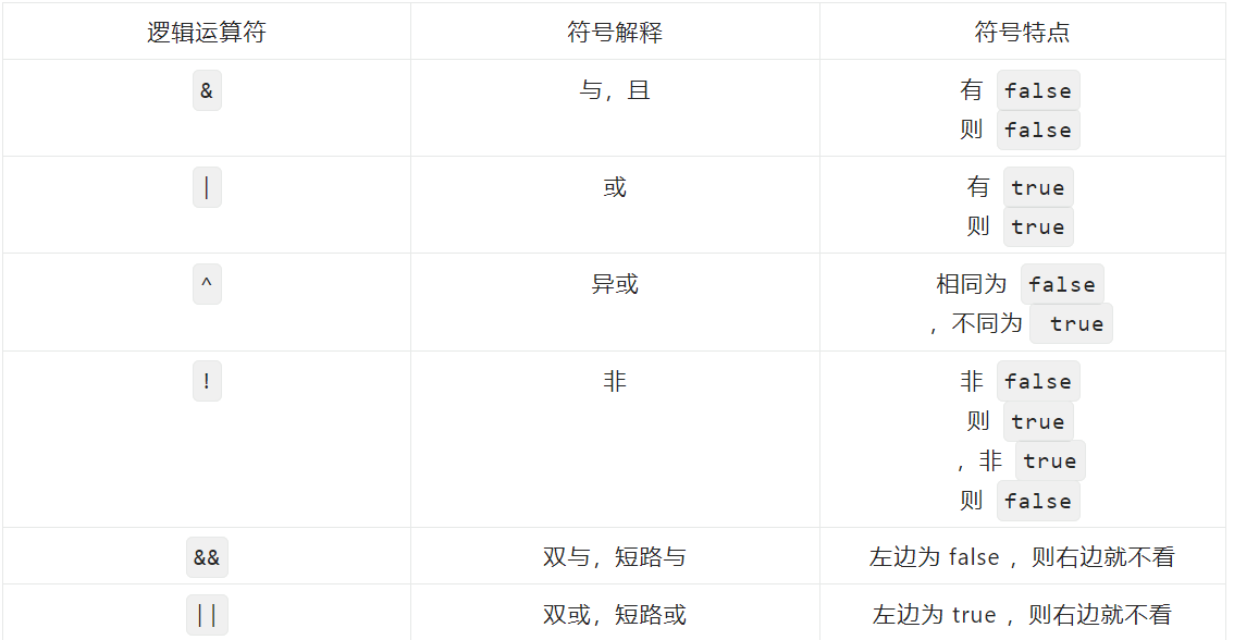 - 逻辑运算符,是用来连接两个 boolean 类型结果的运算符( ! 除外),运算结果一定是 boolean 类型值 true 或 false 。  5.2 应用示例 - 示例: ```bash /** * 逻辑运算符 * * @author maxiaoke.com * @version 1.0 */ public class LogicOperator { public static void main(String[] args) { int a = 3; int b = 4; int c = 5; // & 与,且;有false则false System.out.println((a > b) && (a > c)); // false System.out.println((a < b) && (a < c)); // true System.out.println((a < b) && (a > c)); // false System.out.println((a > b) && (a < c)); // false System.out.println("==============="); // | 或;有true则true System.out.println((a > b) | (a > c)); // false System.out.println((a > b) | (a < c)); // true System.out.println((a < b) | (a > c)); // true System.out.println((a < b) | (a < c)); // true System.out.println("==============="); // ^ 异或;相同为false,不同为true System.out.println((a > b) ^ (a > c)); // false System.out.println((a > b) ^ (a < c)); // true System.out.println((a < b) ^ (a > c)); // true System.out.println((a < b) ^ (a < c)); // false System.out.println("==============="); // ! 非:非false则true,非true则false System.out.println(!false); // true System.out.println(!true); // false } } ``` 5.3 && 和 & 区别,|| 和 | 区别 - && 和 & 区别:&& 和 & 结果一样,&& 有短路效果,左边为 false ,右边不执行;& 左边无论是什么,右边都会执行。 - || 和 | 区别:|| 和 | 结果一样,|| 有短路效果,左边为 true ,右边不执行;| 左边无论是什么,右边都会执行。