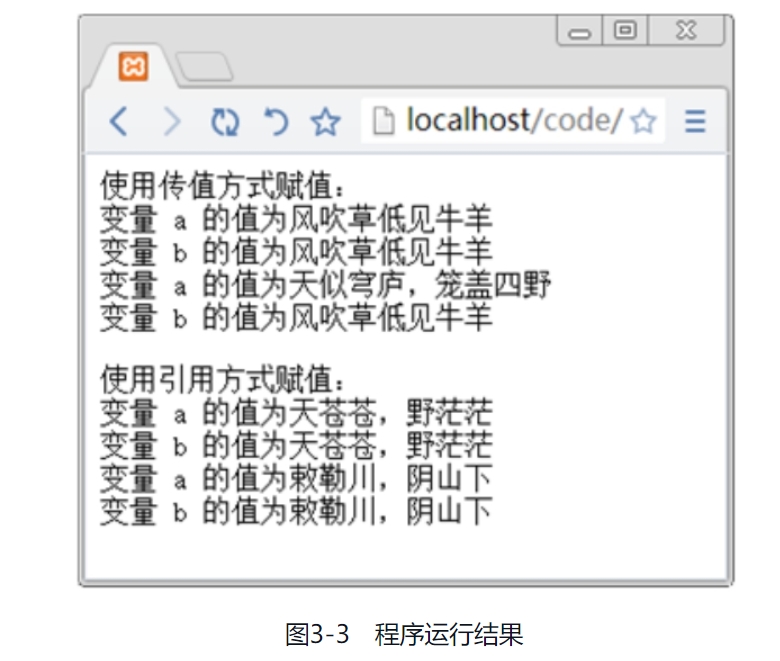 PHP中的变量不同于C或Java语言,因为它是弱类型的。在C或Java中,需要对每一个变量声明类型,但是在PHP中不需要这样做。 PHP中的变量一般以“$”作为前缀,然后以字母a~z的大小写或者“_”下划线开头。这是变量的一般表示。 合法的变量名可以是: ```php $hello $Aform1 $_formhandler (类似我们见过的$_POST等) ``` 非法的变量名如: ```php $168 $!like ``` PHP中不需要显式地声明变量,但是定义变量前进行声明并带有注释,这是一个好的程序员应该养成的习惯。PHP的赋值有两种方式,即传值和引用,区别如下: (1)传值赋值:使用“=”直接将赋值表达式的值赋给另一个变量。 (2)引用赋值:将赋值表达式内存空间的引用赋给另一个变量。需要在“=”左右的变量前面加上一个“&”符号。在使用引用赋值的时候,两个变量将会指向内存中同一个存储空间,所以任意一个变量的变化都会引起另一个变量的变化。 【例3.3】 ```php <?php echo "使用传值方式赋值:<br/>"; // 输出 使用传值方式赋值 $a = "风吹草低见牛羊"; $b = $a; // 将变量$a的值赋值给$b,两个变量指向不同的内存空间 echo "变量a的值为".$a."<br/>"; // 输出 变量a的值 echo "变量b的值为".$b."<br/>"; // 输出 变量b的值 $a = "天似穹庐,笼盖四野"; // 改变变量a的值,变量b的值不受影响 echo "变量a的值为".$a."<br/>"; // 输出 变量a的值 echo "变量b的值为".$b."<p>"; //输出 变量b的值 echo "使用引用方式赋值:<br/>"; //输出 使用引用方式赋值 $a = "天苍苍,野茫茫"; $b = &$a; // 将变量$a的引用赋给$b,两个变量指向同一块内存空间 echo "变量a的值为".$a."<br/>"; // 输出 变量a的值 echo "变量b的值为".$b."<br/>"; // 输出 变量b的值 $a = "敕勒川,阴山下"; /* 改变变量a在内存空间中存储的内容,变量b也指向该空间,b的值也发生变化 */ echo "变量a的值为".$a."<br/>"; // 输出 变量a的值 echo "变量b的值为".$b."<p>"; // 输出 变量b的值 ?> ``` 本程序运行结果如图3-3所示。