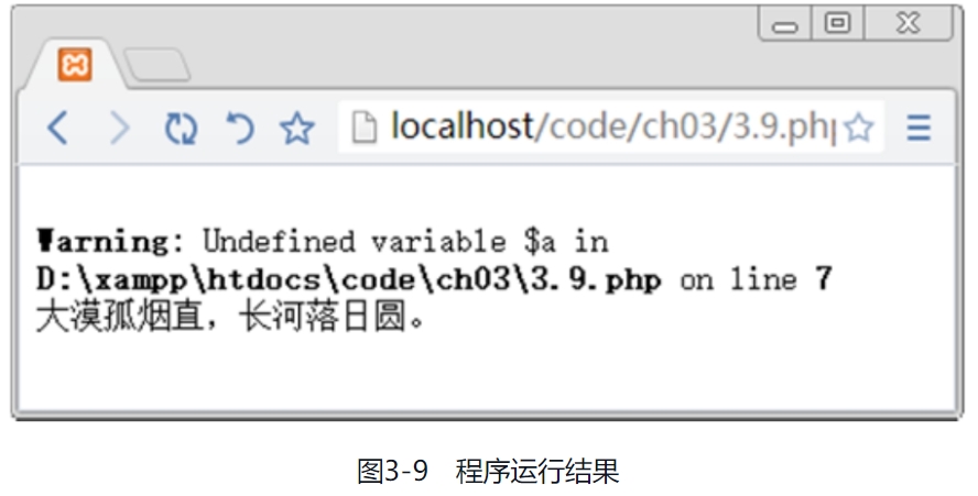 当用户创建一个变量时,相应地在内存中有一个空间专门用于存储该变量,该空间引用计数加1。当变量与该空间的联系被断开时,空间引用计数减1,直到引用计数为0,则成为垃圾。 PHP有自动回收垃圾的机制,用户也可以手动销毁变量,通常使用unset()函数来实现。该函数的语法格式如下: ```php void unset (变量) ``` 其中,若变量类型为局部变量,则变量被销毁;若变量类型为全局变量,则变量不会被销毁。 【例3.9】 ```php <?php $b= "大漠孤烟直,长河落日圆。"; //函数外声明全局变量 function xiaohui() { //声明函数 $a= 10; //函数内声明局部变量 global $b; //函数内使用global关键字声明全局变量$b unset ($a); //使用unset()销毁不再使用的变量$a unset ($b); //使用unset()销毁不再使用的变量$b echo $a; //查看局部变量是否发生变化 } xiaohui(); //调用函数 echo $b; //查看全局变量是否发生变化 ?> ``` 本程序运行结果如图3-9所示。变量销毁后再次调用会提示警告信息。