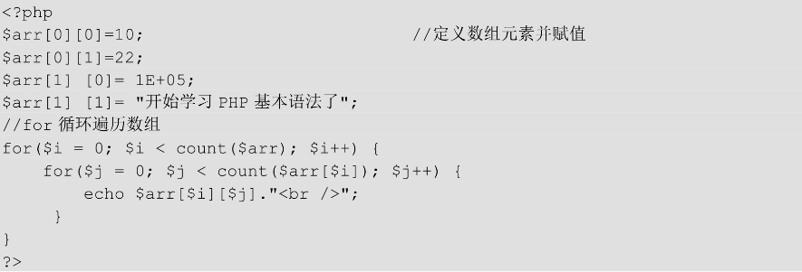 表达式是在特定语言中表达一个特定的操作或动作的语句。PHP的表达式也有同样的作用。 一个表达式包含“操作数”和“操作符”。操作数可以是变量,也可以是常量。操作符则体现了要表达的各个行为,如逻辑判断、赋值、运算等。 例如,$a=5就是表达式,而$a=5;则为语句。另外,表达式也有值,例如$a=1表达式的值为1。 在PHP代码中,使用“;”号来区分表达式,即一个表达式和一个分号组成了一条PHP语句。在编写程序代码时,应该特别注意表达式后面的“;”,不要漏写或写错,否则会提示语法错误。 3.11 实战演练——创建二维数组 前面讲解了如何创建一维数组,本节讲解如何创建多维数组。多维数组和一维数组的区别是多维数组有两个或多个下标,它们的用法基本相似。 下面以创建二维数组为例进行讲解。 【例3.24】  本程序运行结果如图3-25所示。  如何灵活运用命名空间(namespace)? 命名空间作为一个比较宽泛的概念,可以理解为用来封装各个项目的方法。有点像是在文件系统中不同文件夹路径和文件夹当中的文件。两个文件的文件名可以完全相同,但是在不同的文件夹路径下,就是两个完全不同的文件。 PHP的命名空间也是这样的一个概念。它主要用于在“类的命名”“函数命名”及“常量命名”中避免代码冲突和在命名空间下管理变量名和常量名。 命名空间使用namespace关键字在文件头部中定义,例如: ```php <?php namespace 2ndbuilding\number24; //命名空间 class room{} $room = new __NAMESPACE__.room; ?> ``` 命名空间还可以拥有子空间,就像文件夹的路径一样。可以通过内置变量__NAMESPACE__来使用命名空间及其子空间。 如何快速区分常量与变量? 常量和变量的明显区别如下: ·常量前面没有美元符号($)。 ·常量只能用define()函数定义,而不能通过赋值语句定义。 ·常量可以不用理会变量范围的规则而在任何地方定义和访问。 ·常量一旦定义就不能被重新定义或者取消定义。 ·常量的值只能是标量。