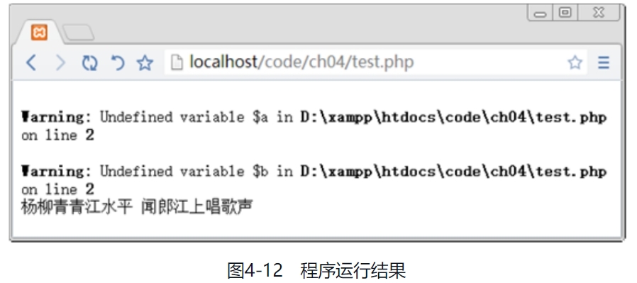 如果想让自定义的函数被多个文件使用,可以将自定义函数组织到一个或者多个文件中,这些收集函数定义的文件就是用户自己创建的PHP函数库。通过使用require()和include()等函数可以将函数库载入脚本程序中。 4.6.1 require和include require()和include()语句不是真正意义的函数,属于语言结构。通过include()和require()语句都可以实现包含并运行指定文件。 (1)require():在脚本执行前读入它包含的文件,通常在文件的开头和结尾处使用。 (2)include():在脚本读到它的时候才将包含的文件读进来,通常在流程控制的处理区使用。 require()和include()语句在处理失败方面是不同的。当文件读取失败后,require将产生一个致命错误,而include则产生一个警告。可见,如果遇到文件丢失需要继续运行,则使用include;如果想停止处理页面,则使用require。 【例4.11】 4.11.php代码如下: ```php <?php $a = '杨柳青青江水平'; //定义一个变量a $b = '闻郎江上唱歌声'; //定义一个变量b ?> ``` test.php代码如下: ```php <?php echo " $a $b"; //未载入文件前调用两个变量 include '4.11.php'; echo " $a $b "; //载入文件后调用两个变量 ?> ``` 运行test.php,结果如图4-12所示。从结果可以看出,使用include时,虽然出现了警告,但是脚本程序仍然在运行。  4.6.2 include_once和require_once include_once和require_once语句在脚本执行期间包含并运行指定文件,作用与include和require语句类似,唯一的区别是,如果该文件的代码已经被包含,则不会再次包含,只会包含一次,从而避免了函数重定义以及变量重赋值等问题。