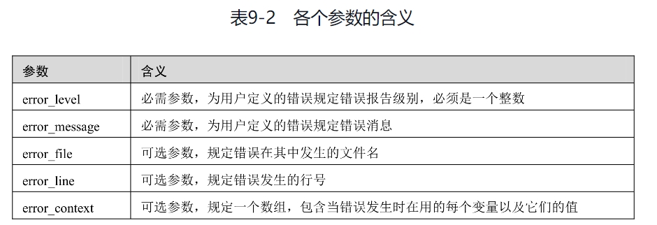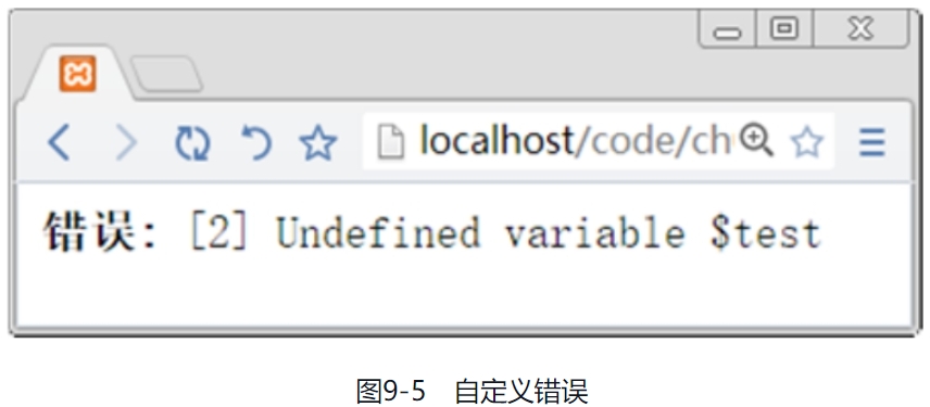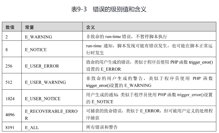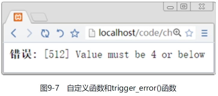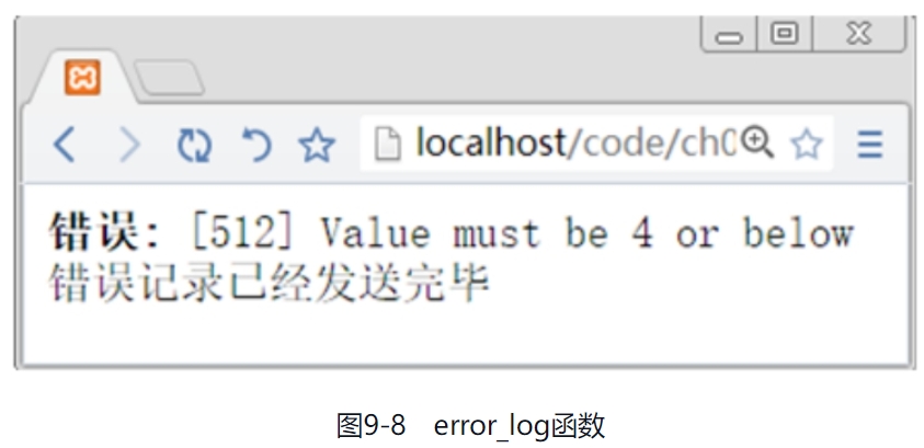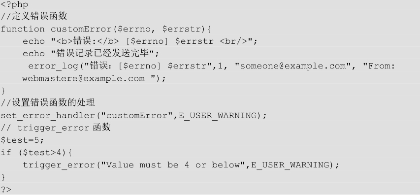 简单地终止脚本并不是恰当的方式。本节将讲解如何自定义错误和错误触发器。创建一个自定义的错误处理器非常简单,用户可以创建一个专用函数,然后在PHP中发生错误时调用该函数。 自定义的错误函数的语法格式如下: ```php error_function(error_level,error_message,error_file,error_line,error_context) ``` 该函数必须至少包含error_level和error_message两个参数,另外3个参数(error_file、error_line和error_context)是可选的。各个参数的具体含义如表9-2所示。  参数error_level定义错误规定的报告级别,这些错误报告级别是错误处理程序旨在处理的错误的不同类型。具体的级别值和含义如表9-3所示。  下面通过实例来讲解如何自定义错误和错误触发器。 首先创建一个处理错误的函数: ```php function customError($errno, $errstr) { echo "<b>错误:</b> [$errno] $errstr<br/>"; echo "终止程序"; die(); } ``` 上面的代码是一个简单的错误处理函数。当它被触发时,会取得错误级别和错误消息。然后输出错误级别和消息,并终止程序。 创建了一个错误处理函数后,下面需要确定在何时触发该函数。在PHP中,使用set_error_handler()函数设置用户自定义的错误处理函数。该函数用于创建运行时的用户自己的错误处理方法。该函数会返回旧的错误处理程序,若失败,则返回null。具体的语法格式如下: ```php set_error_handler(error_function,error_types) ``` 其中,error_function为必需参数,规定发生错误时运行的函数。error_types是可选参数,如果不选择此参数,就表示默认值为E_ALL。 在本例中,由于针对所有错误来使用自定义错误处理程序,具体的代码如下: ```php set_error_handler("customError"); ``` 下面通过尝试输出不存在的变量来测试这个错误处理程序。 【例9.2】 ```php <?php //定义错误函数 function customError($errno, $errstr){ echo "<b>错误:</b> [$errno] $errstr"; } //设置错误函数的处理 set_error_handler("customError"); //触发自定义错误函数 echo($test); ?> ``` 运行后结果如图9-5所示。  在脚本中用户输入数据的位置,当用户的输入无效时,需要触发错误。在PHP中,这个任务由trigger_error()完成。 trigger_error()函数创建用户自定义的错误消息。trigger_error()用于在用户指定的条件下触发一个错误消息。它与内建的错误处理器一同使用,也可以与由set_error_handler()函数创建的用户自定义函数一起使用。如果指定了一个不合法的错误类型,该函数返回false,否则返回true。 trigger_error()函数的具体语法格式如下: ```php trigger_error(error_message,error_types) ``` 其中,error_message为必需参数,规定错误消息,长度限制为1024个字符。error_types为可选参数,规定错误消息的错误类型,可能的值为E_USER_ERROR、E_USER_WARNING和E_USER_NOTICE。 【例9.3】 ```php <?php $test=5; if ($test>4){ trigger_error("Value must be 4 or below"); //创建自定义错误信息 } ?> ``` 运行后结果如图9-6所示。由于test数值为5,因此将会发生E_USER_WARNING错误。  下面通过实例来讲解trigger_error()函数和自定义函数一起使用的处理方法。 【例9.4】 ```php <?php //定义错误函数 function customError($errno, $errstr){ echo "<b>错误:</b> [$errno] $errstr"; } //设置错误函数的处理 set_error_handler("customError",E_USER_WARNING); // trigger_error函数 $test=5; if ($test>4){ trigger_error("Value must be 4 or below",E_USER_WARNING); } ?> ``` 运行后结果如图9-7所示。  9.2.4 错误记录 默认情况下,根据php.ini中的error_log配置,PHP向服务器的错误记录系统或文件发送错误记录。通过使用error_log()函数,用户可以向指定的文件或远程目的地发送错误记录。 通过电子邮件向用户自己发送错误消息,也是一种获得指定错误通知的好办法。下面通过实例的方式来讲解。 【例9.5】  运行后结果如图9-8所示。在指定的someone@example.com邮箱中将收到同样的错误信息。