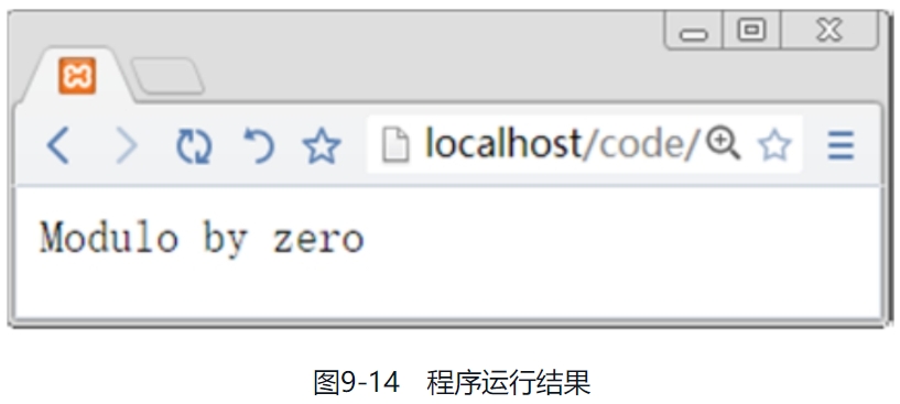 PHP 8改变了大多数错误的报告方式,现在大多数错误被作为Error异常抛出。 这种Error异常可以像普通异常一样被try/catch块所捕获。如果没有匹配的try/catch块,则调用异常处理函数(set_exception_handler())进行处理。如果尚未注册异常处理函数,则按照传统方式处理:被报告为一个致命错误(Fatal Error)。 Error类并不是从Exception类扩展出来的,所以使用catch (Exception $e) { ... }这样的代码是捕获不到Error的。用户可以使用catch (Error $e) { ... }这样的代码,或者通过注册异常处理函数(set_exception_handler())来捕获Error。 【例9.11】  运行结果如图9-14所示。