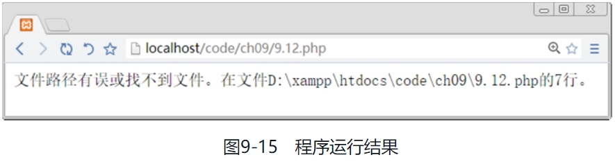 错误处理也叫意外处理。通过使用try…throw…catch结构和一个内置函数Exception()来“抛出”和“处理”错误或异常。 下面通过打开文件的实例介绍意外的处理方法和技巧。 【例9.12】  运行结果如图9-15所示。  【案例分析】 (1)fopen()函数打开$DOCUMENT_ROOT/book.txt文件进行读取,但是由于book.txt文件不存在,因此$fp为false。 (2)try区块判断$fp为false时抛出一个异常。此异常直接通过new关键字生成Exception()类的实例。异常信息是传入参数定义的“文件路径有误或找不到文件”。 (3)catch区块通过处理传入的Exception()类实例显示出错误信息、错误文件、错误发生行。这些是通过直接调用Exception()类实例$exception的内置类方法获得的。错误信息由getMessage()生成,错误文件由getFile()生成,错误发生行由getLine()生成。 补充: 处理异常有什么规则? (1)需要进行异常处理的代码应该放入try代码块内,以便捕获潜在的异常。 (2)每个try或throw代码块必须至少拥有一个对应的catch代码块。 (3)使用多个catch代码块可以捕获不同种类的异常。 (4)可以在try代码块内的catch代码块中再次抛出(re-thrown)异常。 PHP 8在异常处理方面有什么新变化? PHP 8改变了大多数错误的报告方式。不同于PHP 5的传统错误报告机制,现在大多数错误被作为Error异常抛出。这种Error异常可以像普通异常一样被try/catch块所捕获。如果没有匹配的try/catch块,则按照传统方式处理:被报告为一个致命错误(Fatal Error)。