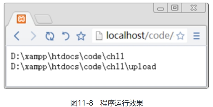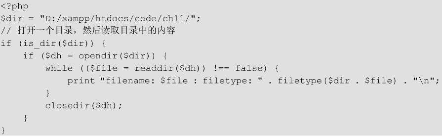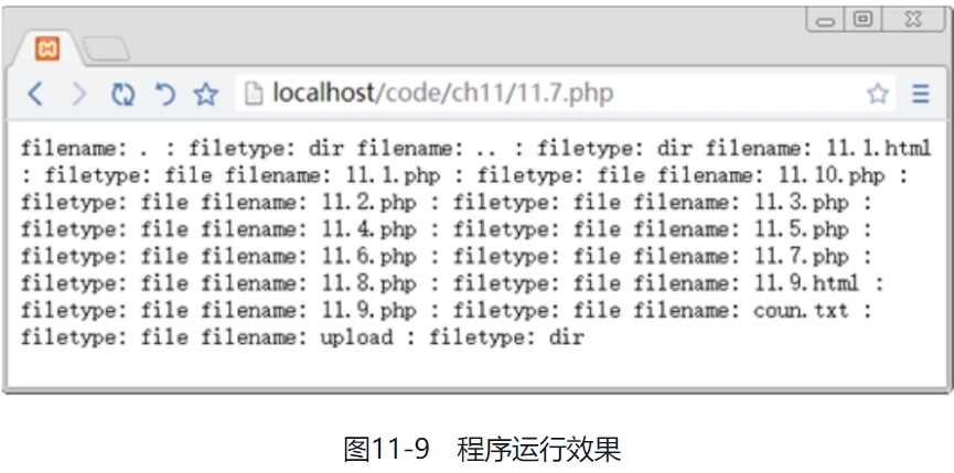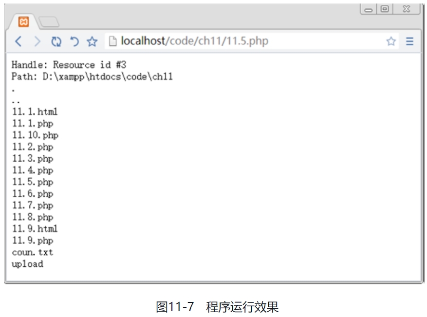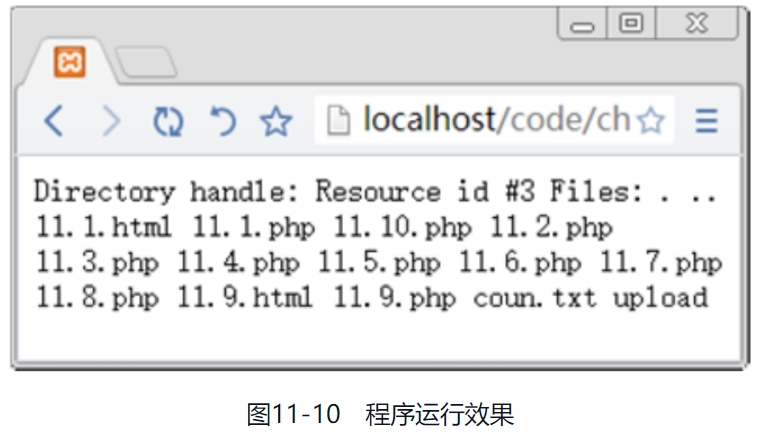 1.string getcwd (void) 该函数主要用于获取当前的工作目录,返回的是字符串。下面举例说明此函数的使用方法。 【例11.3】 ```php <?php $d1=getcwd(); //获取当前路径 echo getcwd(); //输出当前目录 ?> ``` 运行结果如图11-5所示。  2.array scandir (string directory, [int sorting_order]) 返回一个array,包含directory中的文件和目录。如果directory不是一个目录,则返回布尔值FALSE,并产生一条E_WARNING级别的错误。默认情况下,返回值是按照字母顺序升序排列的。如果使用了可选参数sorting_order(设为1),则按照字母顺序降序排列。 下面举例说明此函数的使用方法。 【例11.4】 ```php <?php $dir='D:\xampp\htdocs\code\ch11'; //定义指定的目录 $files1 = scandir($dir); //列出指定目录中的文件和目录 $files2 = scandir($dir, 1); print_r($files1); //输出指定目录中的文件和目录 print_r($files2); ?> ``` 运行结果如图11-6所示。  3.new dir(string directory) 此函数模仿面向对象机制,将指定的目录名转换为一个对象并返回,使用说明如下: ```php class dir { dir ( string directory) string path resource handle string read ( void ) void rewind ( void ) void close ( void ) } ``` 其中,handle属性的含义为目录句柄,path属性的含义为打开目录的路径,read(void)函数的含义为读取目录,rewind(void)函数的含义为复位目录,close(void)函数的含义为关闭目录。 下面通过实例说明此函数的使用方法。 【例11.5】 ```php <?php $d2 = dir('D:\xampp\htdocs\code\ch11'); // 定义目录 echo "Handle: ".$d2->handle."<br/>\n"; // 输出目录句柄 echo "Path: ".$d2->path."<br/>\n"; // 输出目录的路径 while (false !== ($entry = $d2->read())) { echo $entry."<br/>\n"; } $d2->close(); ?> ``` 运行结果如图11-7所示。  4.chdir(string directory) 此函数将PHP的当前目录改为directory。下面举例说明此函数的使用方法。 【例11.6】 ```php <?php // 获取当前目录 echo getcwd() . "<br/>"; // 修改当前目录 chdir("upload"); // 获取修改后的当前目录 echo getcwd(); ?> ``` 运行结果如图11-8所示。  5.void closedir (resource dir_handle) 此函数主要用于关闭由dir_handle指定的目录流,另外,目录流必须之前已经被opendir()打开。 6.resource opendir (string path) 此函数返回一个目录句柄,其中path为要打开的目录路径。如果path不是一个合法的目录或者因为权限限制或文件系统错误而不能打开目录,则返回False并产生一个E_WARNING级别的PHP错误信息。如果不想输出错误,可以在opendir()前面加上“@”符号。 【例11.7】  运行结果如图11-9所示。  其中,is_dir()函数主要判断给定文件名是否是一个目录,readdir()函数从目录句柄中读取条目,closedir()函数关闭目录句柄。 7.string readdir (resource dir_handle) 该函数主要是返回目录中下一个文件的文件名。文件名以在文件系统中的排序返回。 【例11.8】  运行结果如图11-10所示。  在遍历目录时,有的读者会经常写出下面错误的遍历方法。 ```php /* 这是错误的遍历目录的方法 */ while ($file = readdir($handle)) { echo "$file\n"; } ```