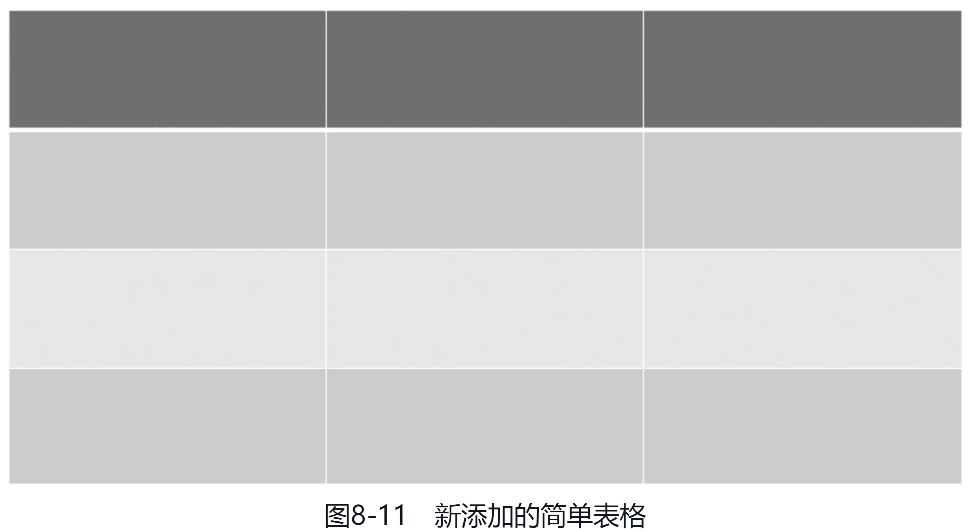 在python-pptx中,表格也是一种形状,所以我们还是要借助SlideShapes对象,它有一个add_table()方法,该方法一共有六个参数,不用担心,这些参数都是很简单的,前面两个参数分别是行数和列数,中间两个参数分别是到达页面左边缘和上边缘的距离,最后两个参数是宽高。如此,我们可以先添加一个表格看看效果,代码如下: ```bash from pptx import Presentation from pptx.util import Cm ppt = Presentation() slide = ppt.slides.add_slide(ppt.slide_layouts[6]) row = 4 column = 3 left = top = Cm(3) width = Cm(20) height = Cm(10) graphic_frame = slide.shapes.add_table(row,column,top,left, width,height) print(type(graphic_frame)) # 输出:<class 'pptx.shapes.graphfrm.GraphicFrame'> ppt.save("./ppt_ files/test.pptx") ``` 结果如我们所料,执行上面的代码之后顺利在PPT中添加了一个4行3列的表格,这个简单的表格会有一个默认的样式,如图8-11所示。
