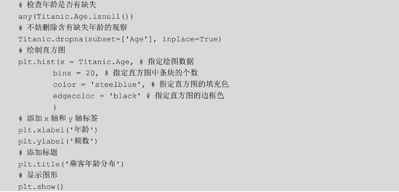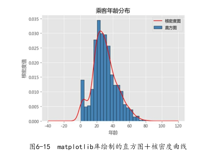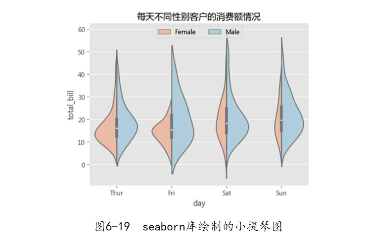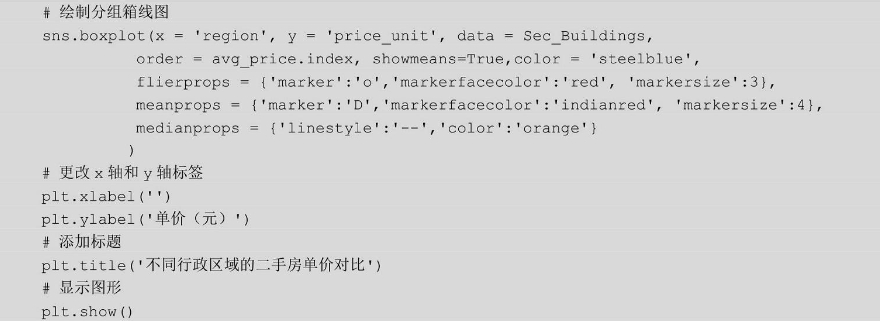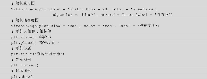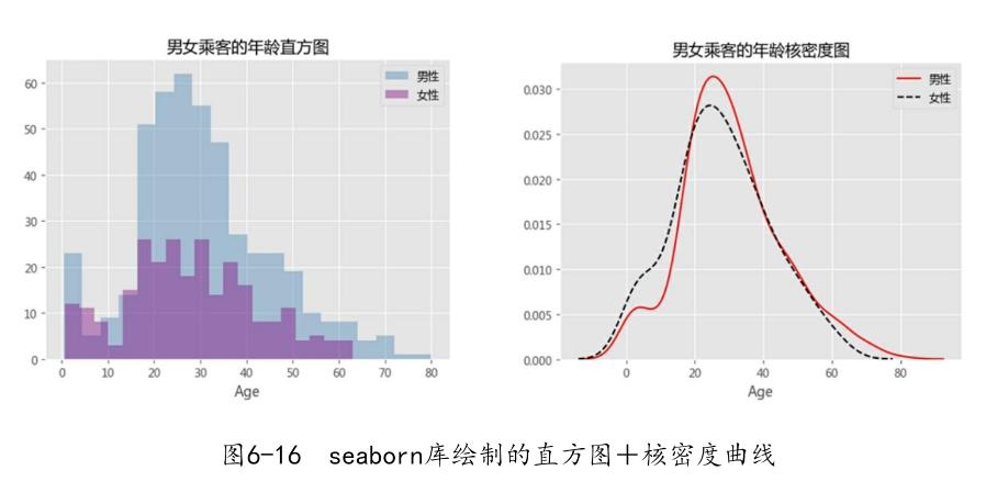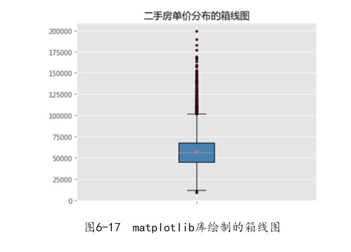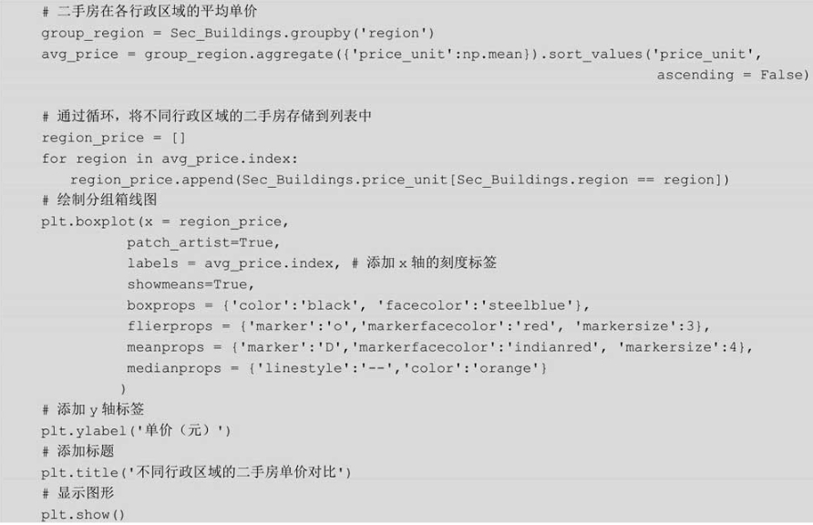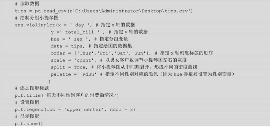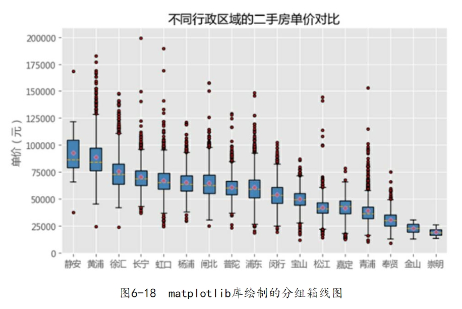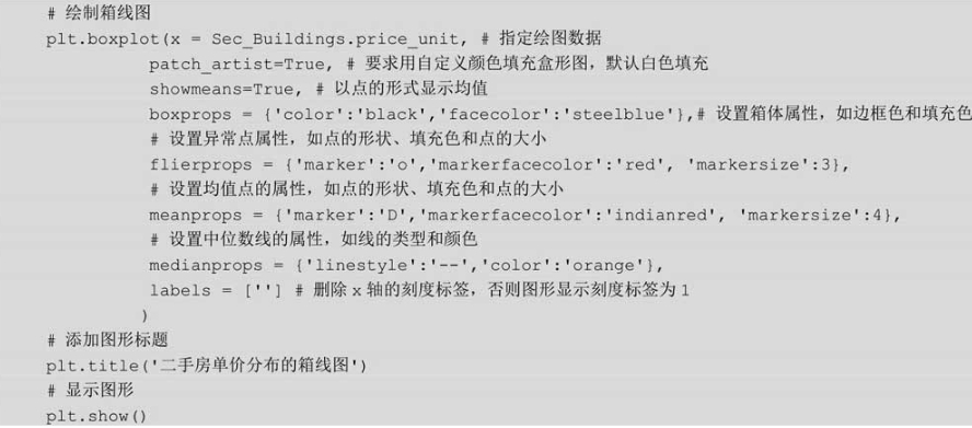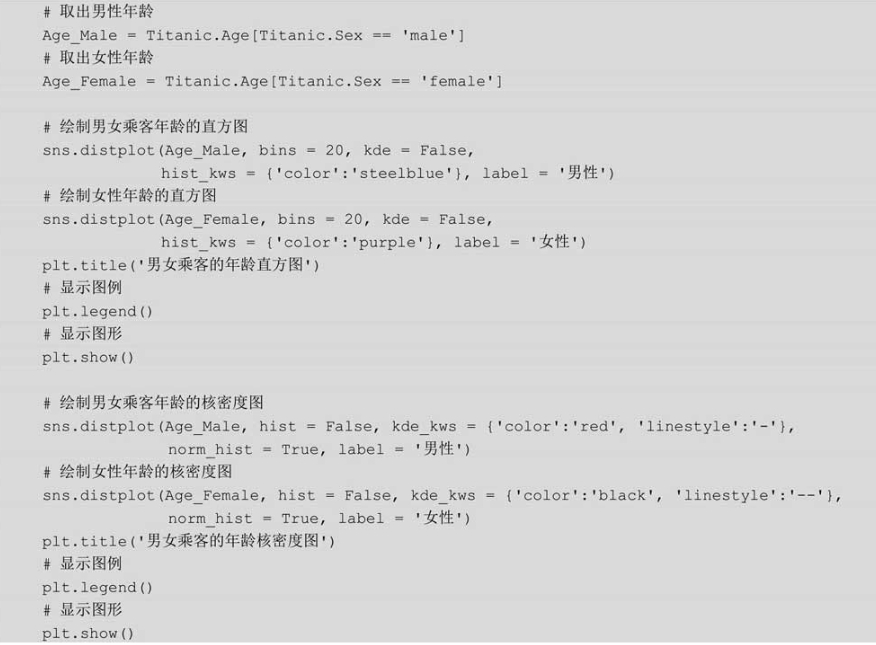 很多时候,我们拿到手的数据都包含大量的数值型变量,在对数值型变量进行探索和分析时,一般都会应用到可视化方法。而本节的重点就是介绍如何使用Python实现数值型变量的可视化,通过本节内容的学习,读者将会掌握如何使用matplotlib模块、pandas模块和seaborn模块绘制直方图、核密度图、箱线图、小提琴图、折线图以及面积图。 6.2.1 直方图与核密度曲线 直方图一般用来观察数据的分布形态,横坐标代表数值的均匀分段,纵坐标代表每个段内的观测数量(频数)。一般直方图都会与核密度图搭配使用,目的是更加清晰地掌握数据的分布特征,下面将详细介绍该类型图形的绘制。 1.matplotlib模块 ```python plt.hist(x, bins=10, range=None, normed=False, weights=None, cumulative=False, bottom=None, histtype='bar', align='mid', orientation='vertical', rwidth=None, log=False, color=None, label=None, stacked=False) ```  这里不妨以Titanic数据集为例绘制乘客的年龄直方图,具体代码如下:   如图6-14所示,就是关于乘客年龄的直方图分布。需要注意的是,如果原始数据集中存在缺失值,一定要对缺失观测进行删除或替换,否则无法绘制成功。如果在直方图的基础上再添加核密度图,通过matplotlib模块就比较吃力了,因为首先得计算出每一个年龄对应的核密度值。为了简单起见,下面利用pandas模块中的plot方法将直方图和核密度图绘制到一起。 2.pandas模块   如图6-15所示,Python的核心代码就两行,分别是利用plot方法绘制直方图和核密度图。需要注意的是,在直方图的基础上添加核密度图,必须将直方图的频数更改为频率,即normed参数设置为True。 3.seaborn模块 尽管这幅图满足了两种图形的合成,但其表达的是所有乘客的年龄分布,如果按性别分组,研究不同性别下年龄分布的差异,该如何实现?针对这个问题,使用matplotlib模块或pandas模块都会稍微复杂一些,推荐使用seaborn模块中的distplot函数,因为该函数的代码简洁而易懂。关于该函数的语法和参数含义如下: ```python sns.distplot(a, bins=None, hist=True, kde=True, rug=False, fit=None, hist_kws=None, kde_kws=None, rug_kws=None, fit_kws=None, color=None, vertical=False, norm_hist=False, axlabel=None, label=None, ax=None) ```  从函数的参数可知,通过该函数,可以实现三种图形的合成,分别是直方图(hist参数)、核密度曲线(kde参数)以及指定的理论分布密度曲线(fit参数)。接下来,针对如上介绍的distplot函数,绘制不同性别下乘客的年龄分布图,具体代码如下:   如图6-16所示,为了避免四个图形混在一起不易发现数据背后的特征,将直方图与核密度图分开绘制。从直方图来看,女性年龄的分布明显比男性矮,说明在各年龄段下,男性乘客要比女性乘客多;再看核密度图,男女性别的年龄分布趋势比较接近,说明各年龄段下的男女乘客人数同步增加或减少。 6.2.2 箱线图 箱线图是另一种体现数据分布的图形,通过该图可以得知数据的下须值(Q1-1.5IQR)、下四分位数(Q1)、中位数(Q2)、均值、上四分位(Q3)数和上须值(Q3+1.5IQR),更重要的是,箱线图还可以发现数据中的异常点。箱线图的绘制仍然可以通过matplotlib模块、pandas模块和seaborn模块完成,下面将一一介绍各模块绘制条形图的过程。 1.matplotlib模块 首先介绍一下matplotlib模块中绘制箱线图的boxplot函数,有关该函数的语法和参数含义如下: ```python plt.boxplot(x, notch=None, sym=None, vert=None, whis=None, positions=None, widths=None, patch_artist=None, meanline=None, showmeans=None, showcaps=None, showbox=None, showfliers=None, boxprops=None, labels=None, flierprops=None, medianprops=None, meanprops=None, capprops=None, whiskerprops=None) ```  为读者方便理解boxplot函数的用法,这里以某平台二手房数据为例,运用箱线图探究其二手房单价的分布情况,具体代码如下:   如图6-17所示,图中的上下两条横线代表上下须、箱体的上下两条横线代表上下四分位数、箱体中的虚线代表中位数、箱体中的点则为均值、上下须两端的点代表异常值。通过图中均值和中位数的对比就可以得知数据微微右偏(判断标准:如果数据近似正态分布,则众数=中位数=均值;如果数据右偏,则众数<中位数<均值;如果数值左偏,则众数>中位数>均值)。 如上绘制的是二手房整体单价的箱线图,这样的箱线图可能并不常见,更多的是分组箱线图,即二手房的单价按照其他分组变量(如行政区域、楼层、朝向等)进行对比分析。下面继续使用matplotlib模块对二手房的单价绘制分组箱线图,代码如下:   应用matplotlib模块绘制如上所示的分组箱线图会相对烦琐一些,由于boxplot函数每次只能绘制一个箱线图,为了能够实现多个箱线图的绘制,对数据稍微做了一些变动,即将每个行政区域下的二手房单价汇总到一个列表中,然后基于这个大列表应用boxplot函数。在绘图过程中,首先做了一个“手脚”,那就是统计各行政区域二手房的平均单价,并降序排序,这样做的目的就是让分组箱线图能够降序呈现。 虽然pandas模块中的plot方法可以绘制分组箱线图,但是该方法是基于数据框执行的,并且数据框的每一列对应一个箱线图。对于二手房数据集来说,应用plot方法绘制分组箱线图不太合适,因为每一个行政区的二手房数量不一致,将导致无法重构一个新的数据框用于绘图。 2.seaborn模块 如果读者觉得matplotlib模块绘制分组箱线图比较麻烦,可以使用seaborn模块中的boxplot函数。下面不妨先了解一下该函数的参数含义: ```python sns.boxplot(x=None, y=None, hue=
