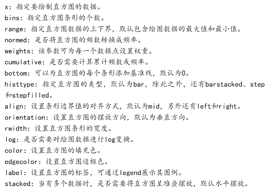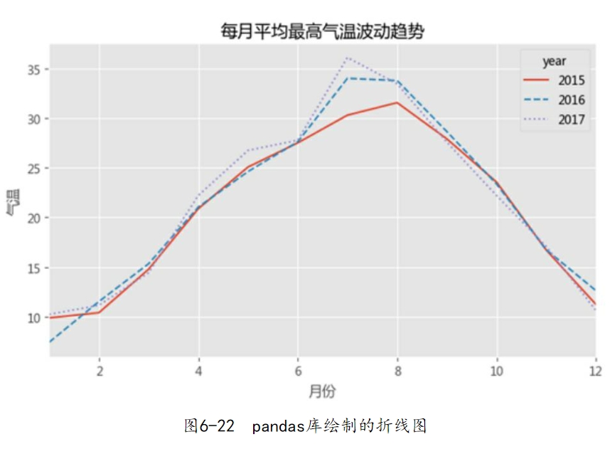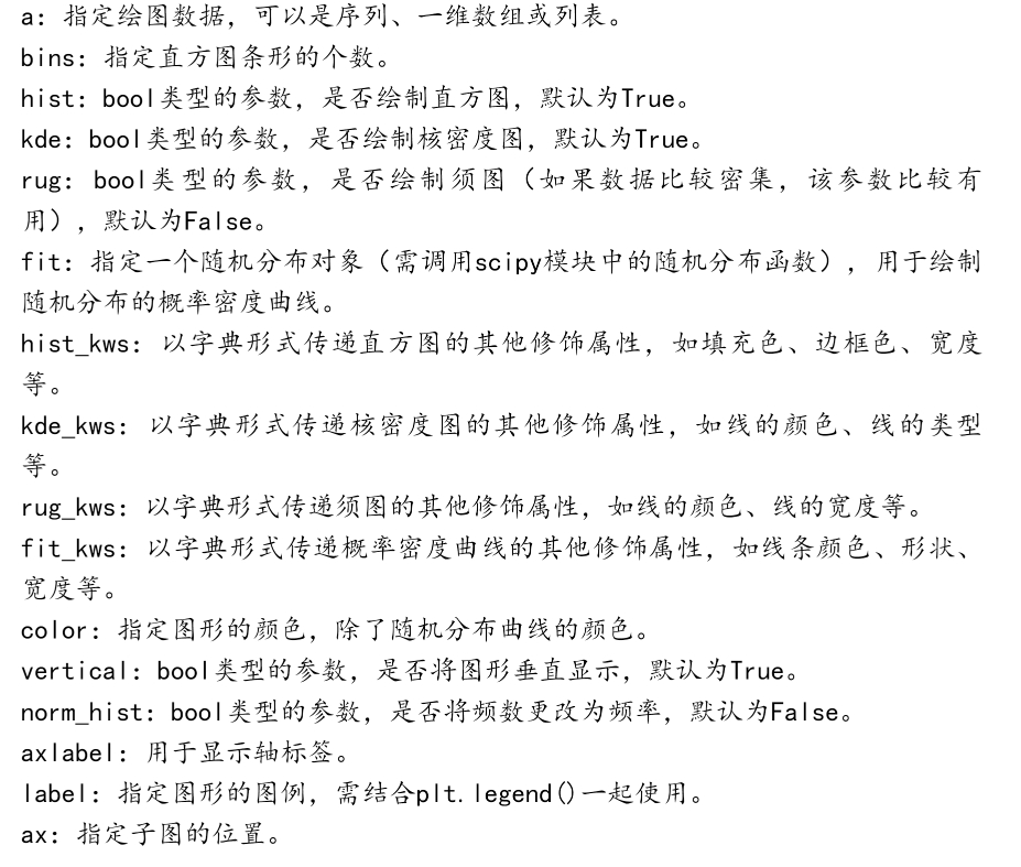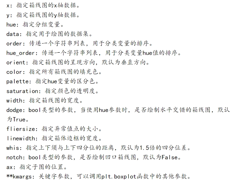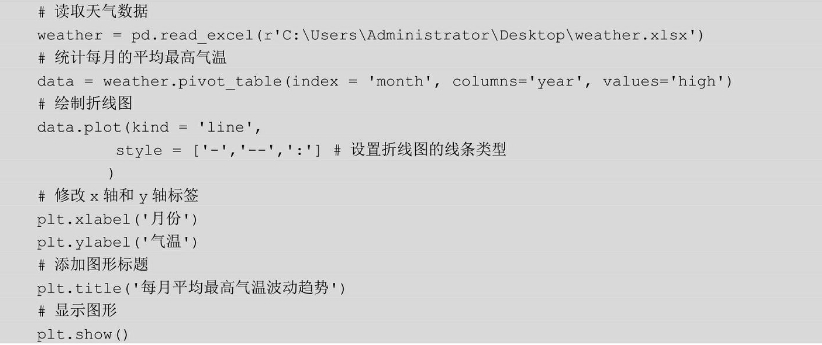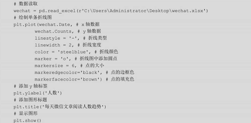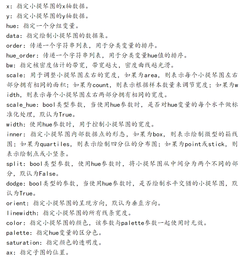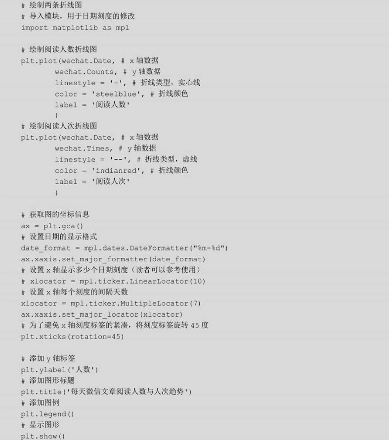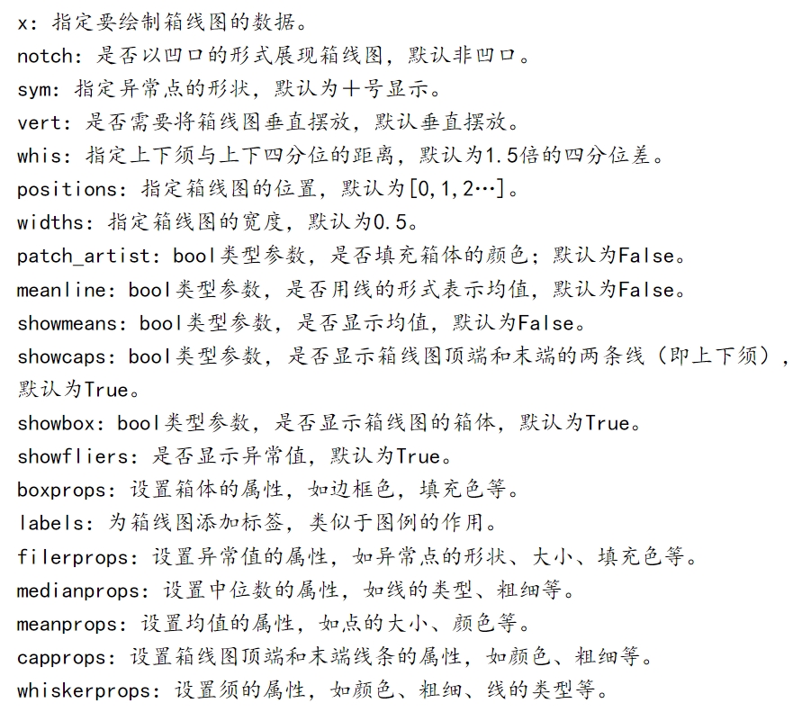 很多时候,我们拿到手的数据都包含大量的数值型变量,在对数值型变量进行探索和分析时,一般都会应用到可视化方法。而本节的重点就是介绍如何使用Python实现数值型变量的可视化,通过本节内容的学习,读者将会掌握如何使用matplotlib模块、pandas模块和seaborn模块绘制直方图、核密度图、箱线图、小提琴图、折线图以及面积图。 6.2.1 直方图与核密度曲线 直方图一般用来观察数据的分布形态,横坐标代表数值的均匀分段,纵坐标代表每个段内的观测数量(频数)。一般直方图都会与核密度图搭配使用,目的是更加清晰地掌握数据的分布特征,下面将详细介绍该类型图形的绘制。 1.matplotlib模块 ```python plt.hist(x, bins=10, range=None, normed=False, weights=None, cumulative=False, bottom=None, histtype='bar', align='mid', orientation='vertical', rwidth=None, log=False, color=None, label=None, stacked=False) ```  这里不妨以Titanic数据集为例绘制乘客的年龄直方图,具体代码如下:   如图6-14所示,就是关于乘客年龄的直方图分布。需要注意的是,如果原始数据集中存在缺失值,一定要对缺失观测进行删除或替换,否则无法绘制成功。如果在直方图的基础上再添加核密度图,通过matplotlib模块就比较吃力了,因为首先得计算出每一个年龄对应的核密度值。为了简单起见,下面利用pandas模块中的plot方法将直方图和核密度图绘制到一起。 2.pandas模块   如图6-15所示,Python的核心代码就两行,分别是利用plot方法绘制直方图和核密度图。需要注意的是,在直方图的基础上添加核密度图,必须将直方图的频数更改为频率,即normed参数设置为True。 3.seaborn模块 尽管这幅图满足了两种图形的合成,但其表达的是所有乘客的年龄分布,如果按性别分组,研究不同性别下年龄分布的差异,该如何实现?针对这个问题,使用matplotlib模块或pandas模块都会稍微复杂一些,推荐使用seaborn模块中的distplot函数,因为该函数的代码简洁而易懂。关于该函数的语法和参数含义如下: ```python sns.distplot(a, bins=None, hist=True, kde=True, rug=False, fit=None, hist_kws=None, kde_kws=None, rug_kws=None, fit_kws=None, color=None, vertical=False, norm_hist=False, axlabel=None, label=None, ax=None) ```  从函数的参数可知,通过该函数,可以实现三种图形的合成,分别是直方图(hist参数)、核密度曲线(kde参数)以及指定的理论分布密度曲线(fit参数)。接下来,针对如上介绍的distplot函数,绘制不同性别下乘客的年龄分布图,具体代码如下:   如图6-16所示,为了避免四个图形混在一起不易发现数据背后的特征,将直方图与核密度图分开绘制。从直方图来看,女性年龄的分布明显比男性矮,说明在各年龄段下,男性乘客要比女性乘客多;再看核密度图,男女性别的年龄分布趋势比较接近,说明各年龄段下的男女乘客人数同步增加或减少。 6.2.2 箱线图 箱线图是另一种体现数据分布的图形,通过该图可以得知数据的下须值(Q1-1.5IQR)、下四分位数(Q1)、中位数(Q2)、均值、上四分位(Q3)数和上须值(Q3+1.5IQR),更重要的是,箱线图还可以发现数据中的异常点。箱线图的绘制仍然可以通过matplotlib模块、pandas模块和seaborn模块完成,下面将一一介绍各模块绘制条形图的过程。 1.matplotlib模块 首先介绍一下matplotlib模块中绘制箱线图的boxplot函数,有关该函数的语法和参数含义如下: ```python plt.boxplot(x, notch=None, sym=None, vert=None, whis=None, positions=None, widths=None, patch_artist=None, meanline=None, showmeans=None, showcaps=None, showbox=None, showfliers=None, boxprops=None, labels=None, flierprops=None, medianprops=None, meanprops=None, capprops=None, whiskerprops=None) ```  为读者方便理解boxplot函数的用法,这里以某平台二手房数据为例,运用箱线图探究其二手房单价的分布情况,具体代码如下:   如图6-17所示,图中的上下两条横线代表上下须、箱体的上下两条横线代表上下四分位数、箱体中的虚线代表中位数、箱体中的点则为均值、上下须两端的点代表异常值。通过图中均值和中位数的对比就可以得知数据微微右偏(判断标准:如果数据近似正态分布,则众数=中位数=均值;如果数据右偏,则众数<中位数<均值;如果数值左偏,则众数>中位数>均值)。 如上绘制的是二手房整体单价的箱线图,这样的箱线图可能并不常见,更多的是分组箱线图,即二手房的单价按照其他分组变量(如行政区域、楼层、朝向等)进行对比分析。下面继续使用matplotlib模块对二手房的单价绘制分组箱线图,代码如下:   应用matplotlib模块绘制如上所示的分组箱线图会相对烦琐一些,由于boxplot函数每次只能绘制一个箱线图,为了能够实现多个箱线图的绘制,对数据稍微做了一些变动,即将每个行政区域下的二手房单价汇总到一个列表中,然后基于这个大列表应用boxplot函数。在绘图过程中,首先做了一个“手脚”,那就是统计各行政区域二手房的平均单价,并降序排序,这样做的目的就是让分组箱线图能够降序呈现。 虽然pandas模块中的plot方法可以绘制分组箱线图,但是该方法是基于数据框执行的,并且数据框的每一列对应一个箱线图。对于二手房数据集来说,应用plot方法绘制分组箱线图不太合适,因为每一个行政区的二手房数量不一致,将导致无法重构一个新的数据框用于绘图。 2.seaborn模块 如果读者觉得matplotlib模块绘制分组箱线图比较麻烦,可以使用seaborn模块中的boxplot函数。下面不妨先了解一下该函数的参数含义: ```python sns.boxplot(x=None, y=None, hue=